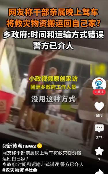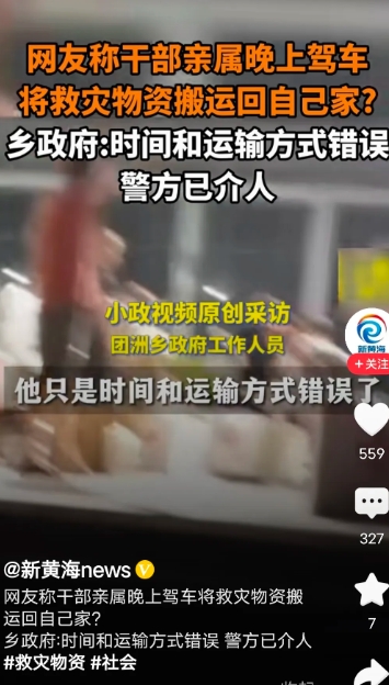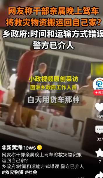 就在刚刚有网友爆料:看到干部家属晚上驾车,将救灾物资往自家拉。乡政府回应:初步估计是个误会,他只是时间和运输方式错了。目前网友已经报警,警方正式介入调查。 唉,让我们怎么说好呢!救灾物资一般都是急需物资,拿到手就该立马发放给受灾的老百姓。往自己家里拉,不管真实目的是啥,都让相关人员都有口难辩。