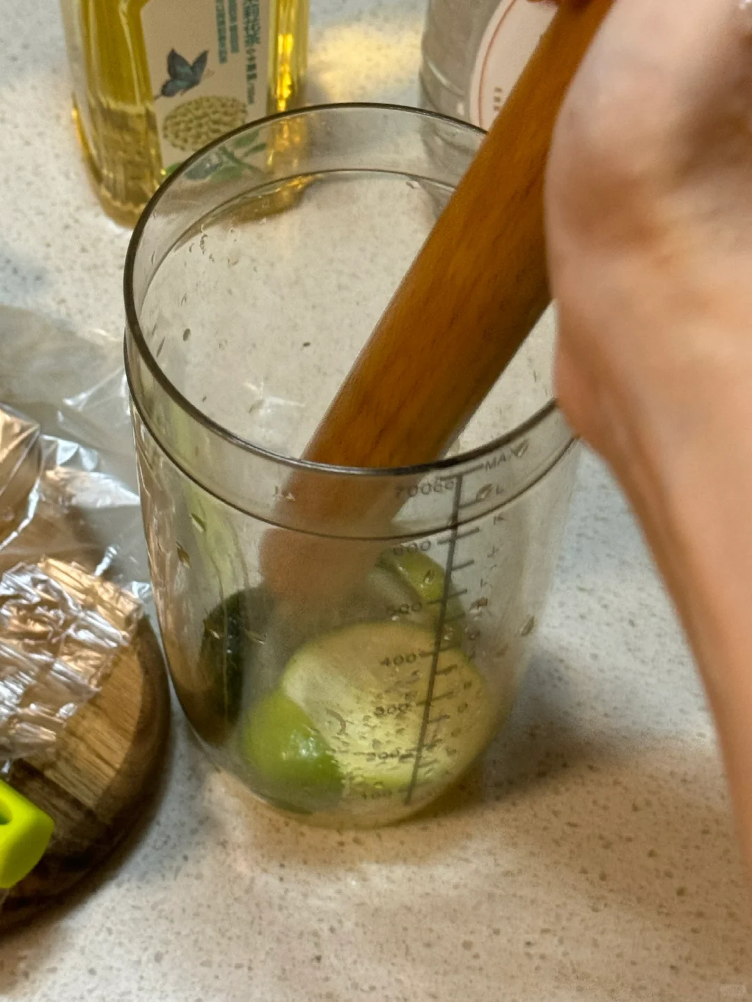 🌷食材:小青桔两个,香水柠檬,糖浆,茉莉花茶。 🌷做法:1.小青柑对半切开,去籽,香水柠檬切片。 2.放入雪克杯中压出汁(不要太用力,不然会发苦) 3.加入糖浆20ml,再加入茉莉花茶300ml,加入4块冰块,用吧勺搅拌搅拌(也可以雪克一下) 4.饮品杯中加几块冰,成品倒入饮品中。 🌷这一杯是400ml的配方,小青柑香味独特,清爽好喝,超解暑[赞R]