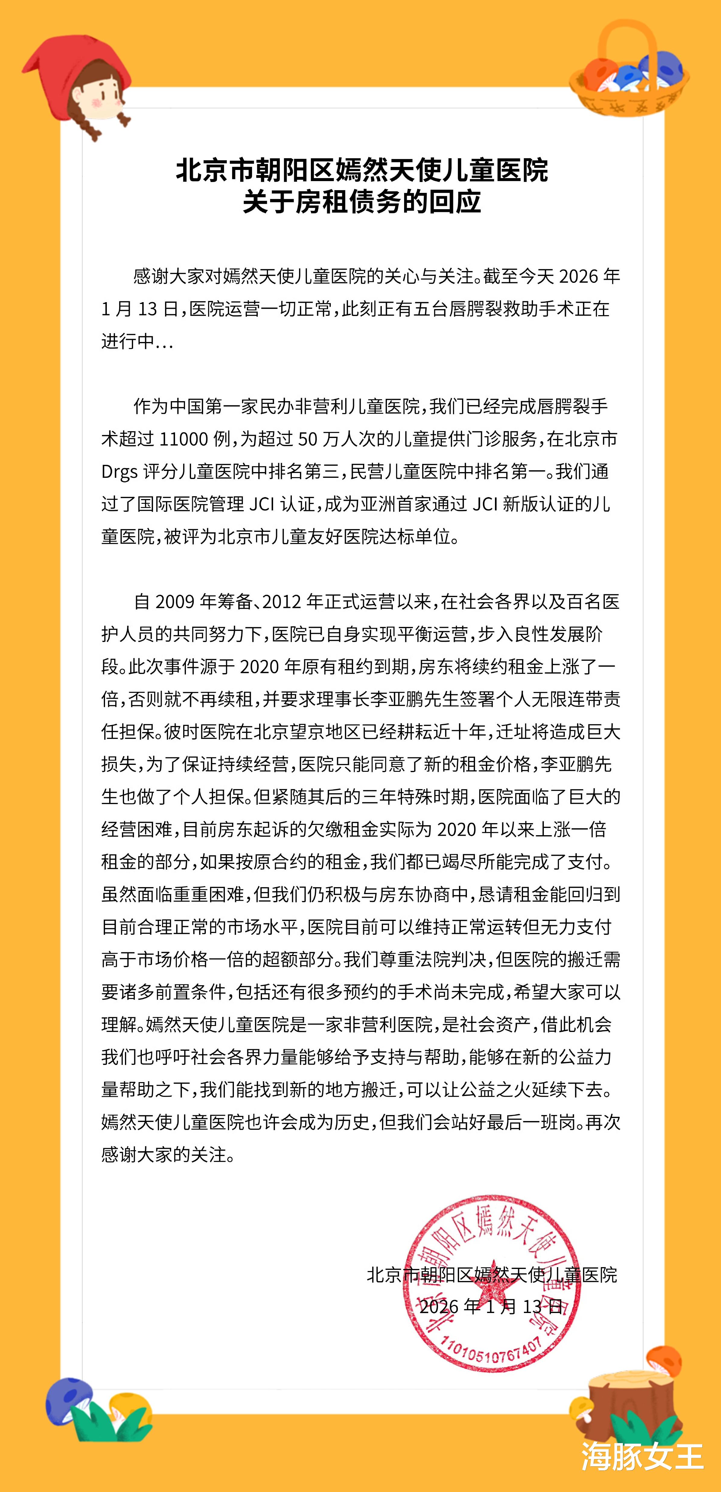 1月13日,李亚鹏发布声明,嫣然儿童医院因为“房租债务问题”,已经经营不下去。
