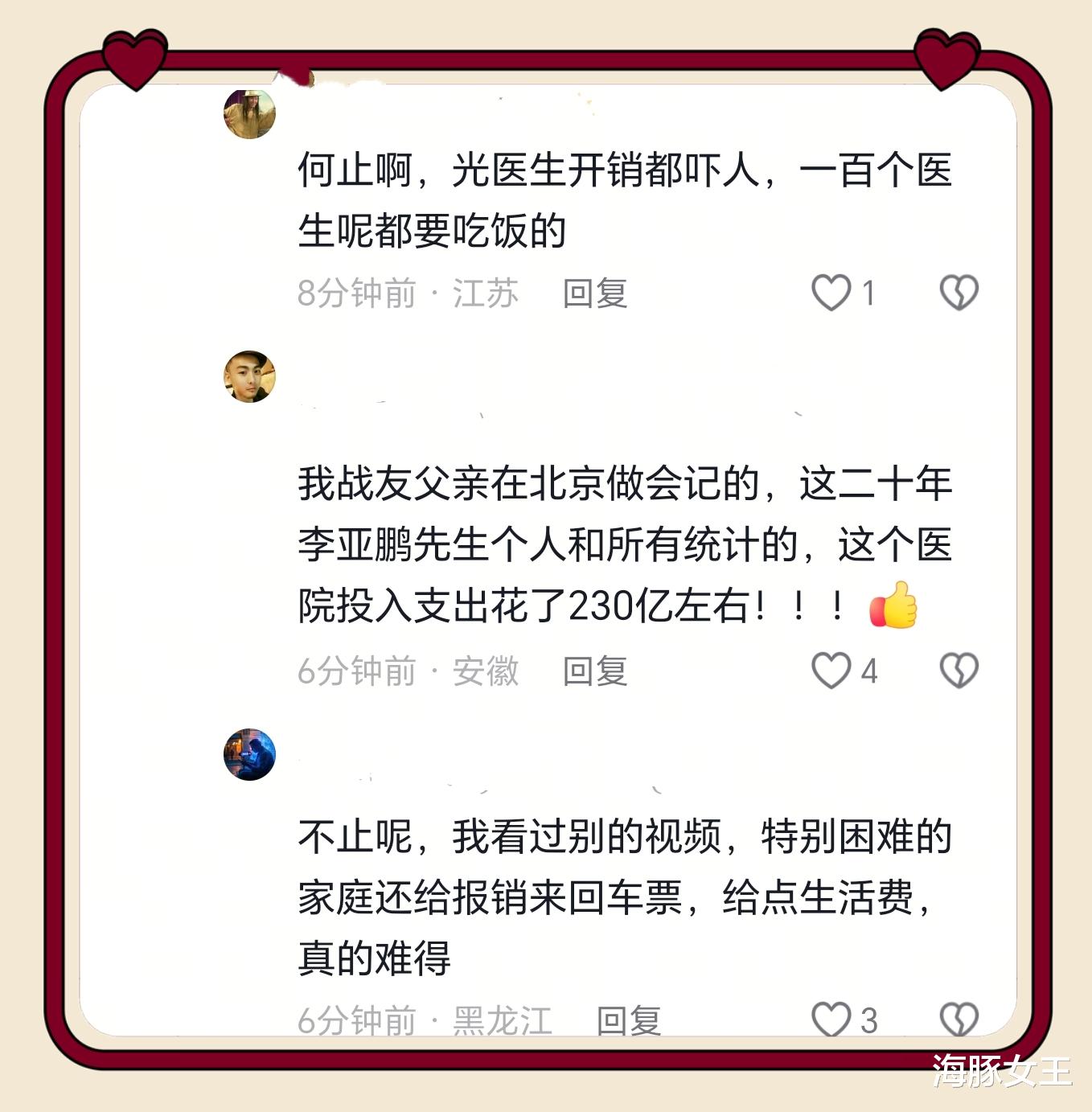 在进庙需要烧香买票的年代,李亚鹏运营的医院居然是免费的,这份大爱无疆,值得大家尊重,无数家境贫困的唇腭裂患者,也需要李亚鹏这样的善人。