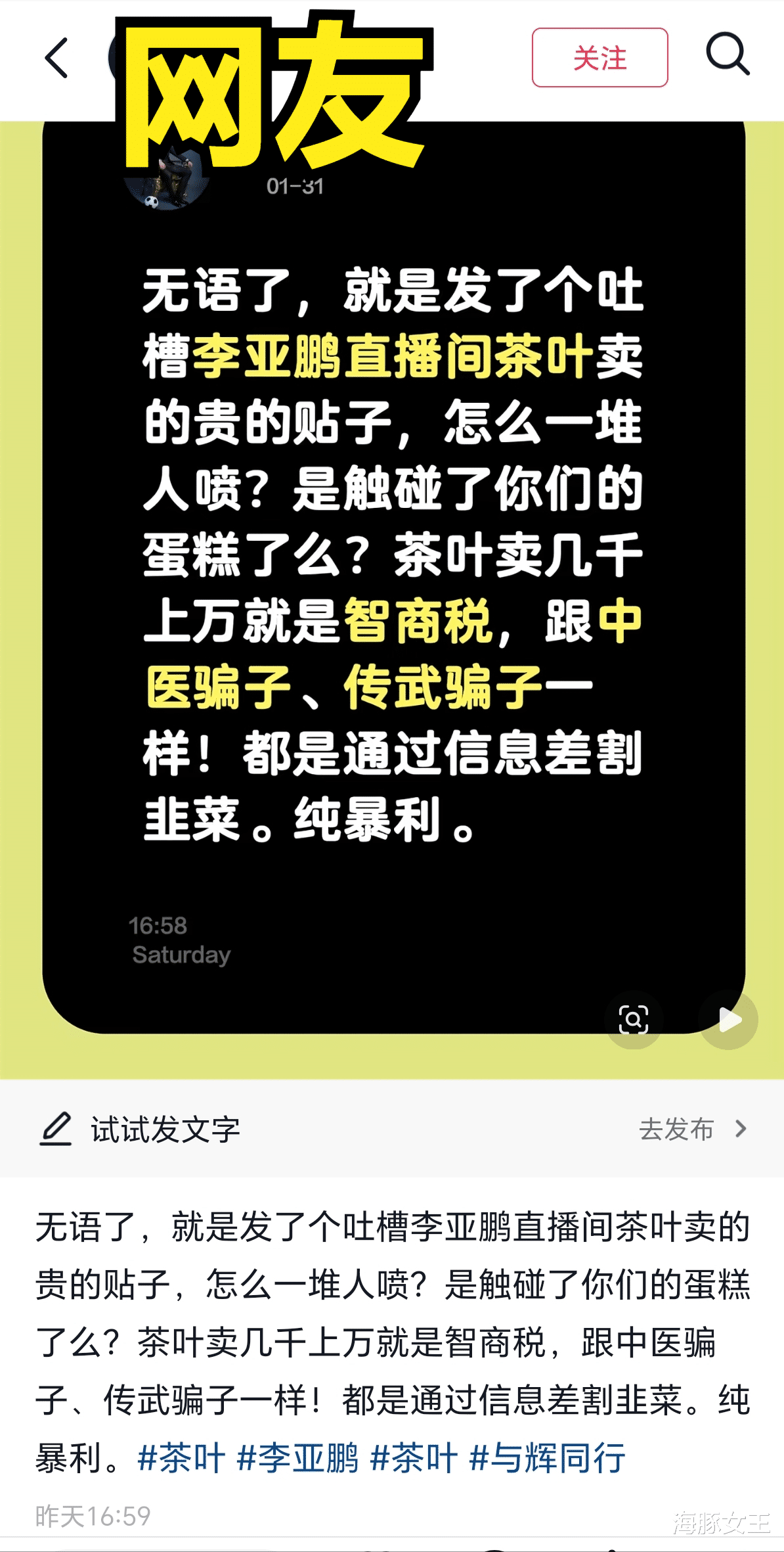也有网友觉得,李亚鹏的茶叶卖几千上万是智商税,跟中医骗子,武术骗子一样,属于纯暴利。
