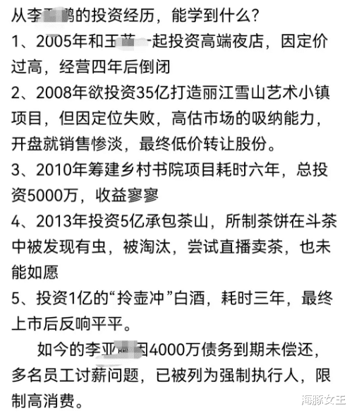 之后李亚鹏又投资了乡村书院,耗资5亿承包茶山,还耗资1亿搞“拎壶冲”白酒,皆以失败告终。