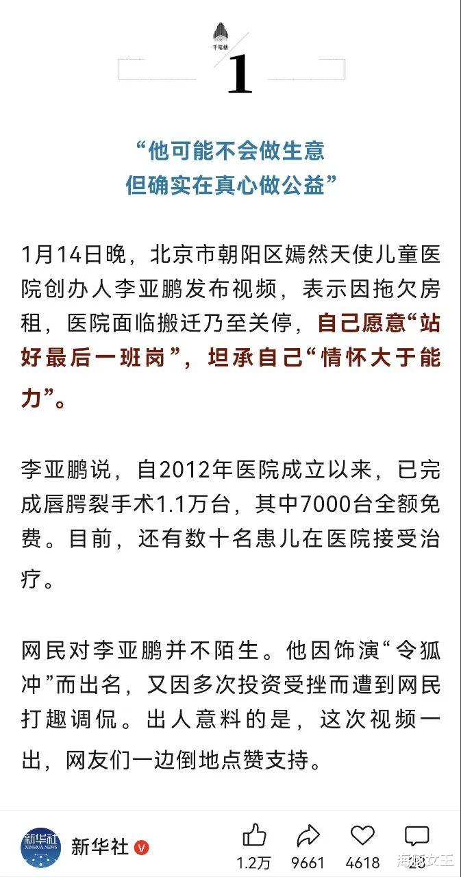 新华社点评李亚鹏,他可能不会做生意,但确实在真心做公益。