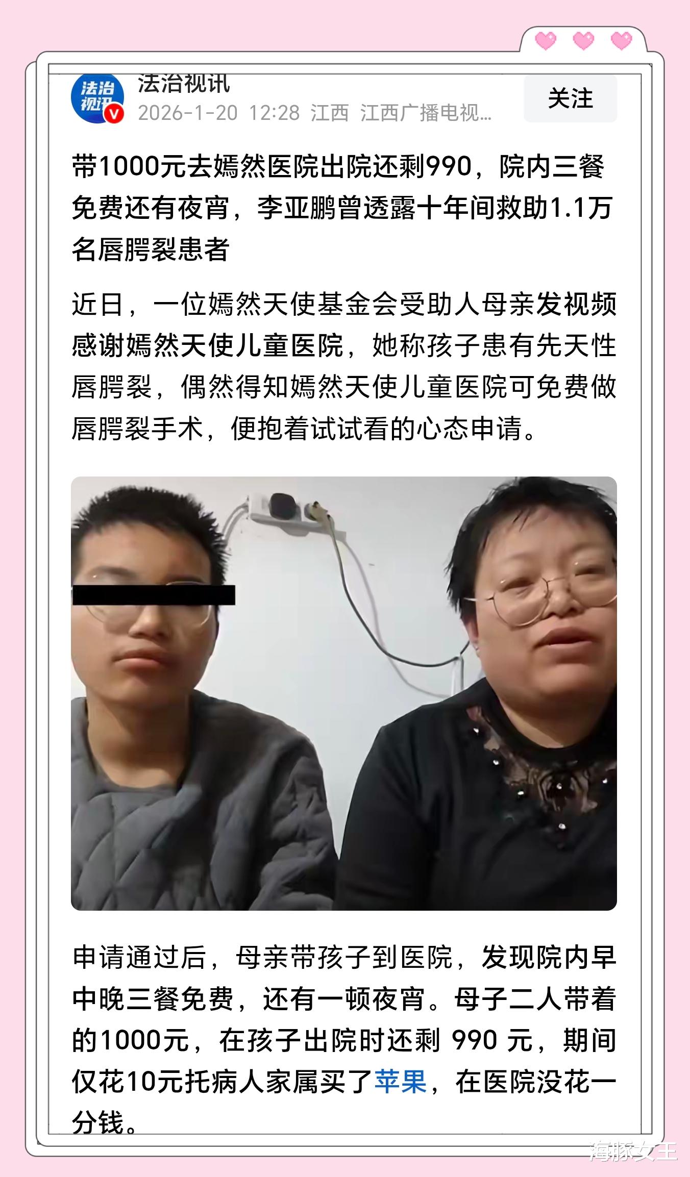 有患者拿了1000元去嫣然儿童医院,发现医院不仅免费做手术,连一日三餐也不用钱。