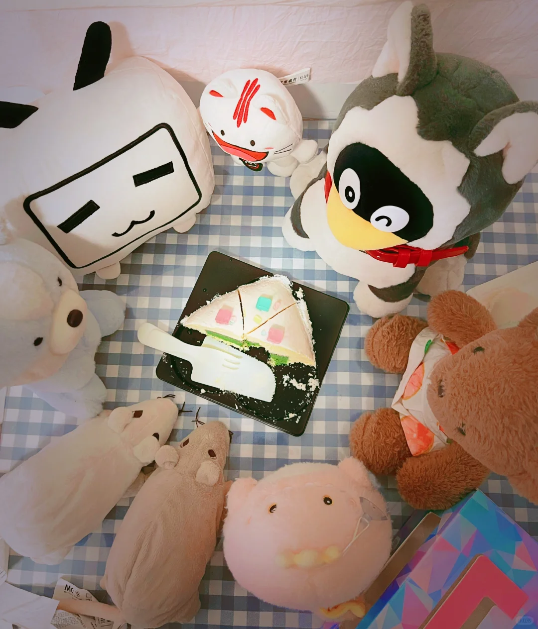 这个时候小比的朋友们(有小电视酱、小招喵酱、大企鹅狗、小熊姐、大小松鼠*2、鼠鼠哥*2)终于赶来,加入了庆祝行列,他们也围坐在一起,开始品尝蛋糕了🍰!