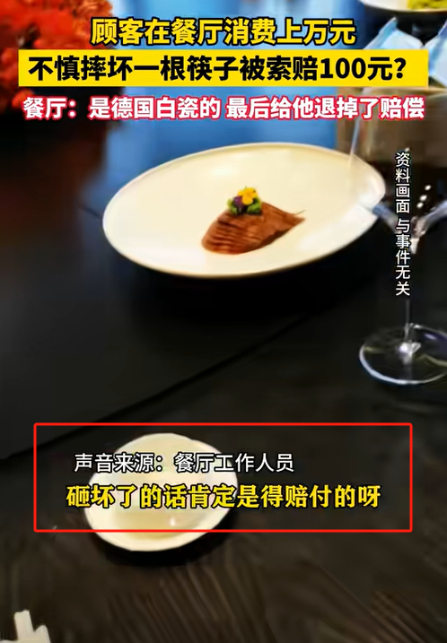 前台告诉他,打碎了餐具是要赔偿的,餐厅的餐具都很贵,一双筷子158元,让他赔偿100元,还给他便宜了!
