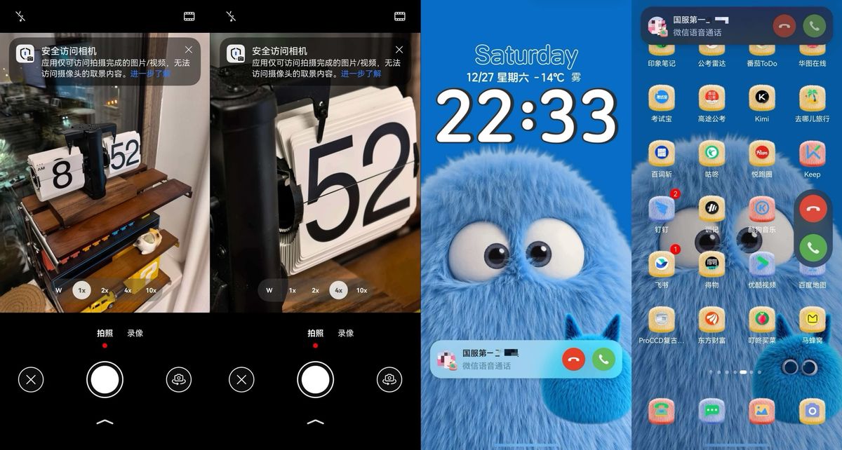 现在你点开鸿蒙版微信,从最基础的聊天、音视频通话,到朋友圈、微信支付,再到小程序、视频号和公众号,这些支撑我们日常社交、生活的核心功能已全部就位。而且鸿蒙版微信还通过深度融合系统特性,实现了很多创新体验,比如在应用内可以调用原相机拍照,画质更佳且支持变焦;锁屏及桌面可直接接听微信电话,并且通话期间可收听好友语音消息;支持智感握姿,微信语音通话/视频通话按钮,可以智能跟随用户握持手机的姿势在侧边显示。