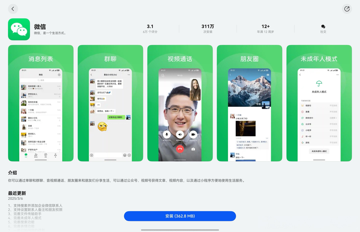 除了手机,微信鸿蒙版也已覆盖更多鸿蒙终端。2025年3月,鸿蒙版微信正式上架平板端,版本号和功能与手机端一致。同年6月底,鸿蒙版微信的电脑客户端也已在应用市场上架,满足了用户多场景使用的需求。