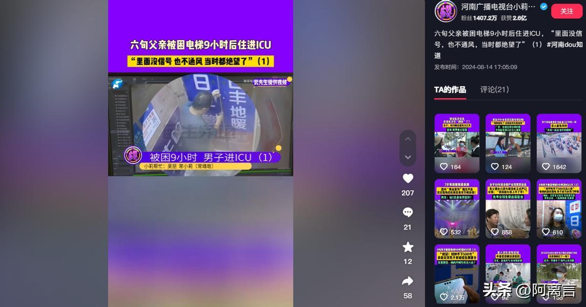 “绝望!”郑州,一老大爷深夜被困电梯9个小时,呼铃数百次,没有一声应答,绝望之下,用手机留下遗言!被救后直接送进了ICU! (信息来源:河南广播电视台小莉帮忙2024年8月14日——六旬父亲被困电梯9小时后住进ICU,“里面没信号,也不通风,当时都绝望了”) 命运有时候就像一扇紧闭的电梯门,你永远不知道它下一秒会把你带向何方。对于河南郑州的这位60岁老人来说,一次再平常不过的乘梯,竟成了他人生中最漫长的一夜。 8月4日晚10点,当这位老人步入小区电梯时,他未曾想到,自己即将踏上一段长达9小时的“地狱之旅”。 电梯门缓缓合上,却再也没有打开。按键失灵,报警铃声杳然无响,老人被困在这个狭小的“铁盒子”里,与外界彻底隔绝。 恐惧,绝望,无助……各种情绪在老人心中翻腾。但他并没有就此放弃,而是开始了一场与死神抗争的自救之旅。 老人先是不断尝试按下各楼层按钮和报警铃,希望能引起外界注意,但电梯就像一头铁了心的野兽,对他的求救置若罔闻。 无奈之下,老人只能动手拆卸电梯内的纸板,试图撬开电梯门缝隙。 功夫不负有心人,一条细细的门缝终于出现,但也仅够维持呼吸的微弱气流。就在老人觉得自己可能撑不住时,他想到了妻子和年幼的外孙。 他颤抖地掏出手机,用微弱的光亮给妻子编辑了一条“遗言”般的短信:“我卡在电梯里两个多小时了,如果我出不去,你要照顾好自己和女儿……” 9个小时,电梯内的氧气越来越稀薄,老人的意识也越来越模糊。直到第二天早上7点,隔壁电梯传来动静,老人用尽最后一丝力气呼救,才终于引起物业注意,再次见到光明。 但这场电梯“牢狱”给老人留下了难以磨灭的身心创伤。获救后,他因身体虚弱被紧急送往医院ICU,在重症监护室整整躺了5天。回想起那一夜,老人和家人都心有余悸。 这起触目惊心的事件,再次敲响了电梯安全的警钟。究竟是谁的疏忽,才酿成这场悲剧?为何电梯报警铃和呼叫按钮形同虚设?又是谁,应该为这位老人的遭遇负责? 物业和开发商的推诿让人愤怒,频发的电梯事故更让人心寒。从杭州孕妇流产到云南电梯坠毁,一次次血的教训昭示着,我们的电梯安全之路任重道远。 这不仅需要相关部门加强质检监管,更需要开发商和物业肩负起应尽的责任。完善应急预案,定期排查隐患,畅通报警求助渠道,我们要从点滴做起,织密电梯安全防护网。 毕竟,每一次乘梯,都关乎生命。电梯不该成为“命运之门”,它理应是安全便捷的代名词。让我们携手努力,还电梯一个本该属于它的安全品质,避免悲剧重演。 这个故事告诉我们,灾难面前,生命是如此脆弱,但人性又是如此坚韧。那位老人靠着顽强的求生意志,硬生生从死神手中夺回一线生机。而他对家人的牵挂,更让我们看到了亲情的伟大。 但我们不能仅仅停留在感动,更应该行动起来,去守护每一个鲜活的生命。或许我们无法左右命运,但我们可以尽自己的一份力,去构建一个更加安全、有温度的世界。 这,就是这个故事带给我们的启示。让我们从这位老人的遭遇中汲取教训,用行动诠释生命的意义,去点亮那一盏盏希望之灯。