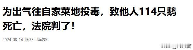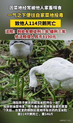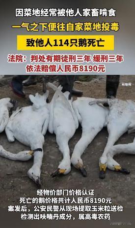 “讹天讹地讹空气!”2024年,湖南,一男子油菜地屡遭啃食,询问未果后,他直接将拌有农药的玉米,放到了菜地中!却不料,7天后,一村民的114只鹅都被他投下的农药给毒死了,最终该男子被村民告上了法庭,那么结果如何呢? (信息来源:海峡网——《为出气往自家菜地投毒,致他人114只鹅死亡,法院判了!》) 2024年,湖南省花垣县,一个宁静祥和的小山村,最近发生了一件令人唏嘘不已的悲剧事件。 麻某某是村里有名的老实人,靠着几亩薄田度日。他在自家菜地辛勤种下油菜,希望来年能有个好收成。 可好景不长,隔壁龙某某家的一群大白鹅,不知何时盯上了他的菜田,隔三差五来“光顾”。 起初,麻某某还能睁一只眼闭一只眼。可渐渐地,眼看着自己的心血被鹅群糟蹋得一干二净,他再也忍无可忍。 眼看着满地残菜,麻某某心如刀割。一念之差,他做出了一个让自己后悔终生的决定。 麻某为了抓出破坏自家菜地的罪魁祸首,便买来了农药,将它和食物搅拌后,撒到菜地中。他想,这下那群该死的鹅再来偷吃,就别想活着回去! 果不其然,仅仅7天后,龙某某家的鹅群再次光顾菜地,大快朵颐。可当夜,114只肥美的大白鹅无一幸免,全部毒发身亡。 龙某某发现鹅群悉数毙命,又惊又怒。他算了算,114只鹅足有546斤,按市价15元一斤,损失高达8190元! 龙某某气急败坏,立马报了警。警方调查发现,菜地里的玉米粒含有剧毒农药成分。种种证据指向麻某某。 麻某某到底犯了什么罪?法官指出,麻某某主观上具有危害公共安全的故意,客观上实施了投放危险物质的行为,其行为已触犯刑律。 考虑到麻某某系初犯,且认罪态度较好,法院遂判处其有期徒刑三年,缓刑三年,并责令其赔偿龙某某经济损失8190元。 不少村民为麻某某鸣不平,认为他不过是为了保护自家菜地,何至于判刑? 更有人指责龙某某管理不力,放任鹅群四处作恶,难辞其咎。一时间,众说纷纭,是非难辨。 回望整个事件,令人唏嘘不已。邻里之间,本应和睦相处,互帮互助。可一点小矛盾,竟酿成大悲剧。麻某某因一时冲动,做出极端行为,不仅害了他人,也毁了自己。 龙某某管教不严,纵容鹅群为祸,难逃责任。而无辜的鹅群,更成了人祸的牺牲品。 这起事件,给所有人都提了个醒:农村的公共安全和法治意识,还有很大提升空间。村民们应该学会用法律武器维权,而不是靠极端手段泄愤。 同时,畜禽养殖户也要加强管理,不能让自家牲畜危害他人。只有人人守法,互相包容,才能共创美好家园。