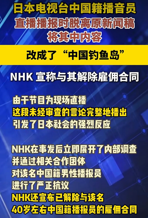 这名中国籍播音员,在直播新闻时,将新闻稿中钓鱼岛的日本名称直接改为“中国钓鱼岛”!该新闻直播之后,在中日两国引起轩然大波!