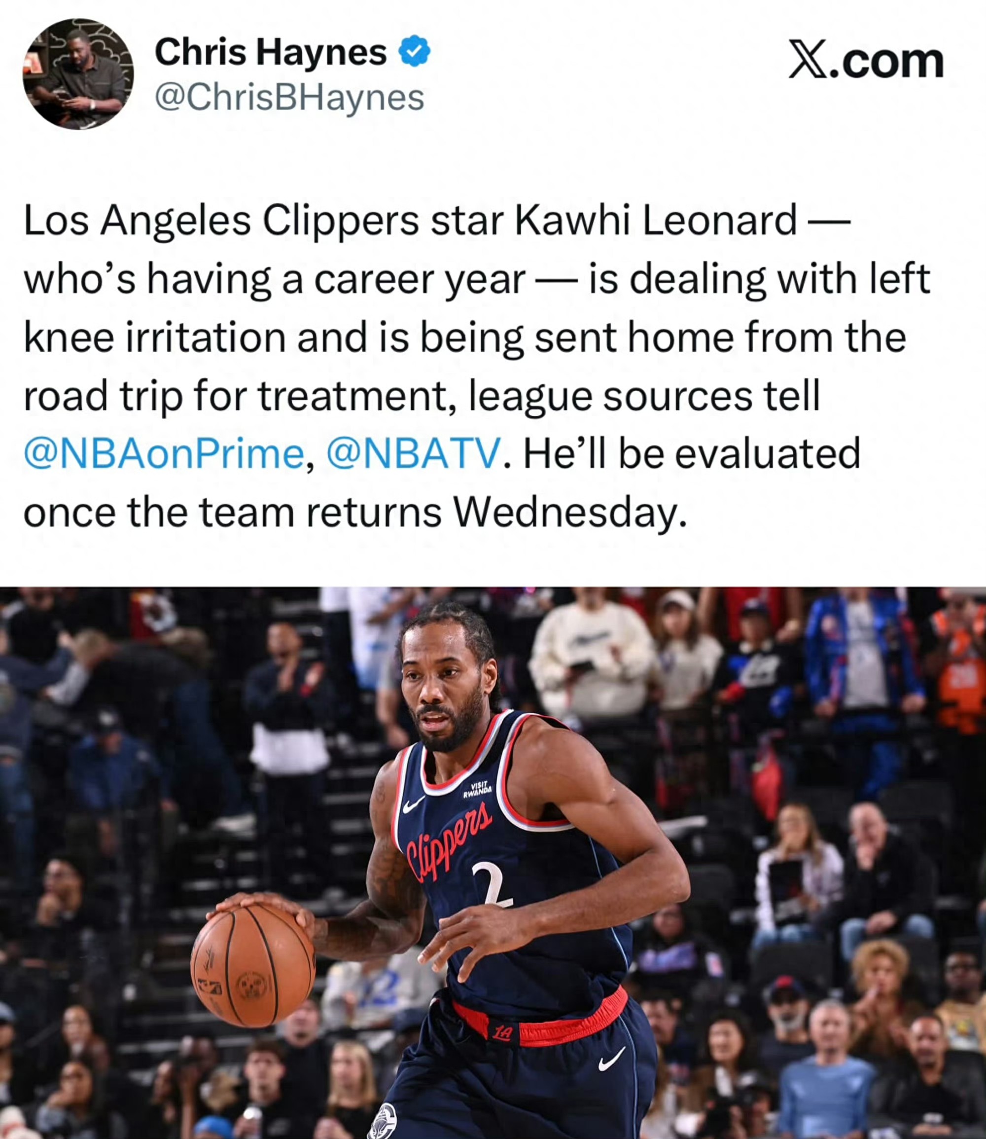 据nba记者Chris Haynes透露,快船前锋莱昂纳德因左膝伤势提前结束客场之旅,返回洛杉矶接受治疗。球队将于周三返程后,对伤情进行重新评估。