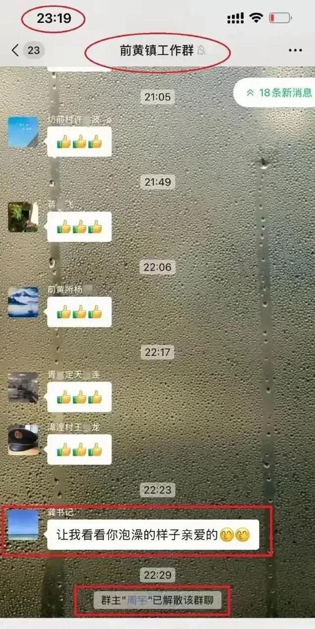 跨年夜前夕,大多数人都在享受节日的欢乐,而前黄镇党委书记龚新宇(以下称龚书记)却意外地成为了网络热点。晚上10时23分,龚书记的一条本该私密的短信错误地发送到了“前黄镇工作群”:“让我看看你泡澡的样子,亲爱的。”并附上了两个飞吻表情。这条短信就像一颗巨大的石子,瞬间在工作群中引起了轩然大波,尽管多数人选择了沉默,但这条信息还是被部分成员悄悄保存了下来。