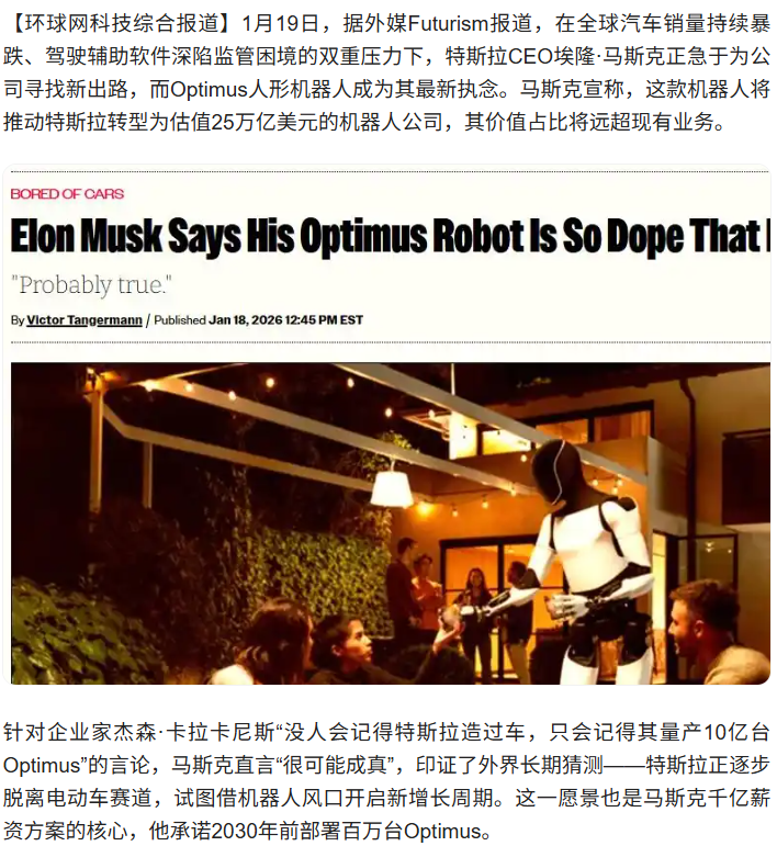 据多家外媒报道,马斯克近期进一步强化“机器人叙事”,称Optimus人形机器人将成为特斯拉下一阶段的核心增长引擎,推动公司从车企加速转型为机器人公司;其并在相关表态与被转述的口径中提出,Optimus带来的长期价值占比将显著高于现有汽车等业务,甚至可将特斯拉推向约25万亿美元级别估值愿景: