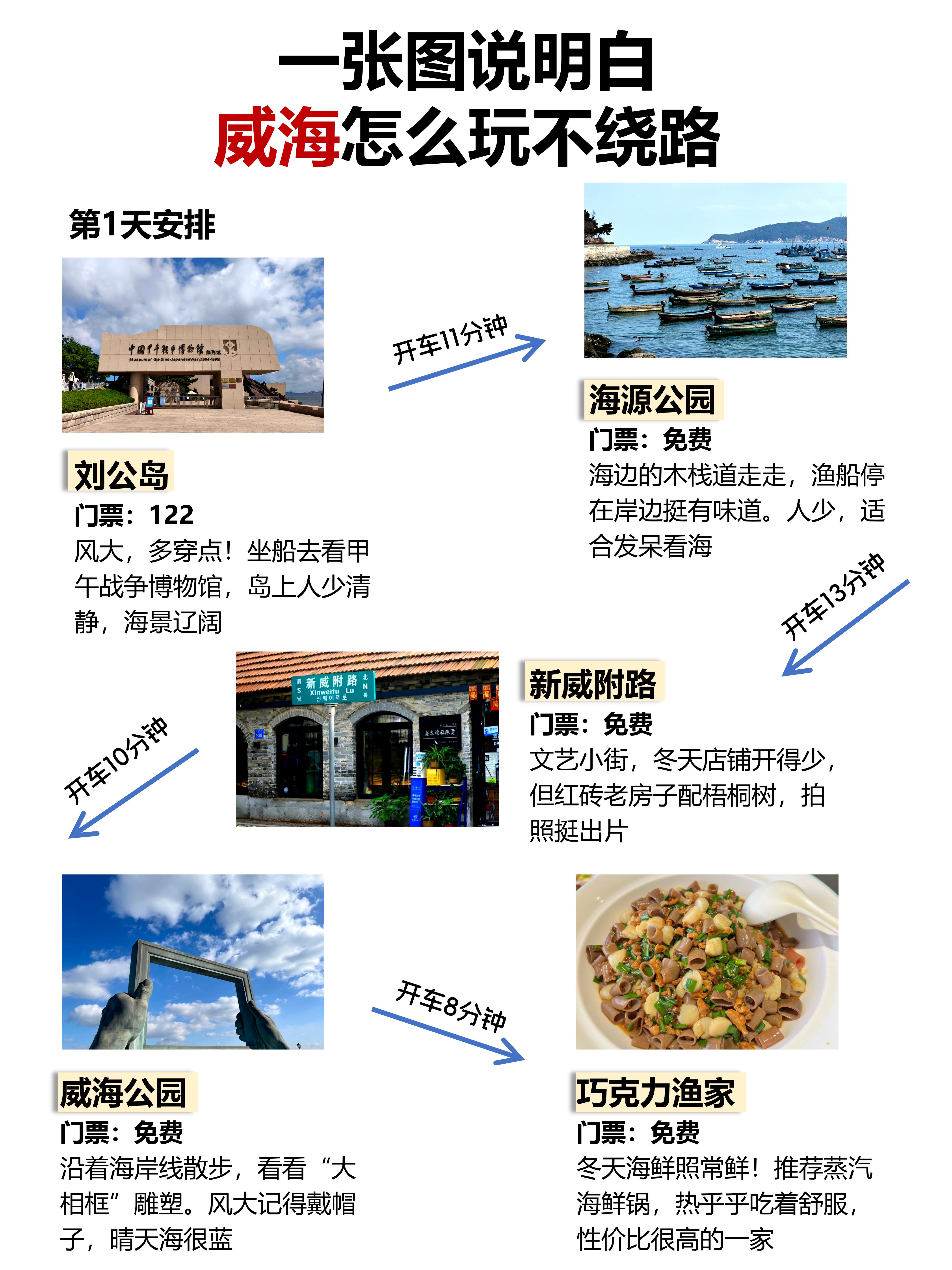 3日游行程安排:Day1:上午:刘公岛(坐船看甲午战争博物馆,人少安静,风大穿厚点)
