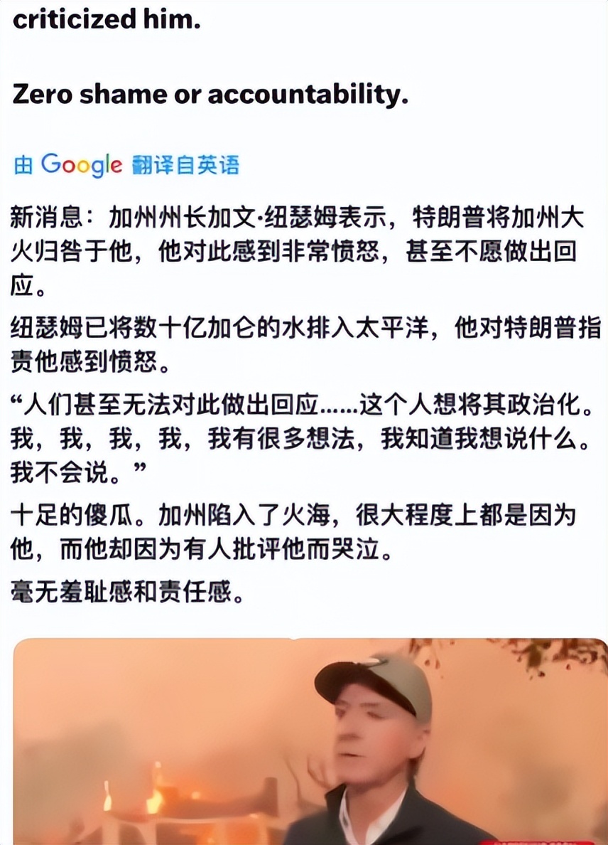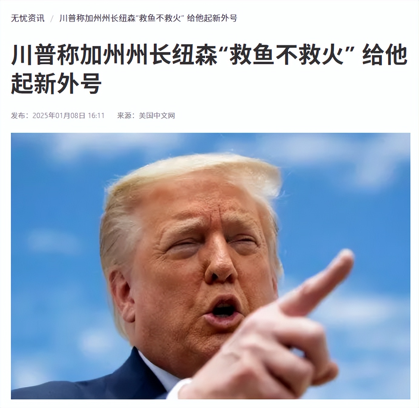 特朗普在社交媒体上表示,纽森为了保护一种“基本上毫无价值的鱼”,阻止了将北加州的水资源调配至南加州,导致消防栓缺水,影响了灭火工作。 他批评纽森的环境政策,认为其过度关注生态保护,忽视了人类的生命安全。