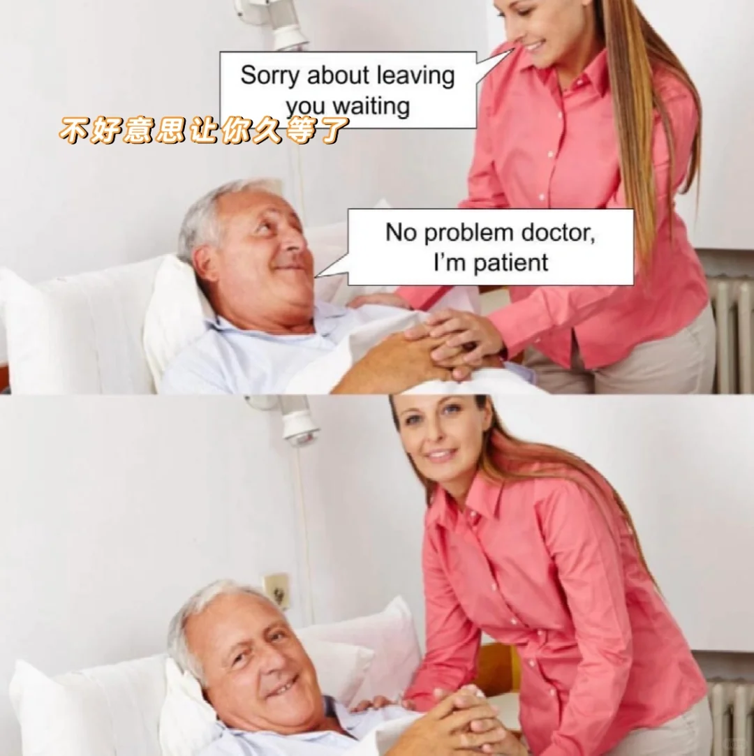 男:没事医生,我有耐心;双关:没事医生,我是病人。