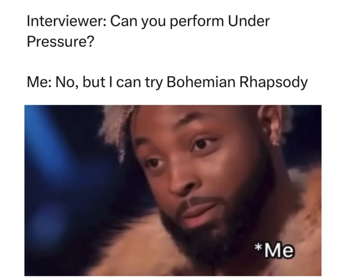 面试者听岔,以为让他perform(演奏)Under Pressure这首歌,所以回:不,但能试下波西米亚狂想曲。