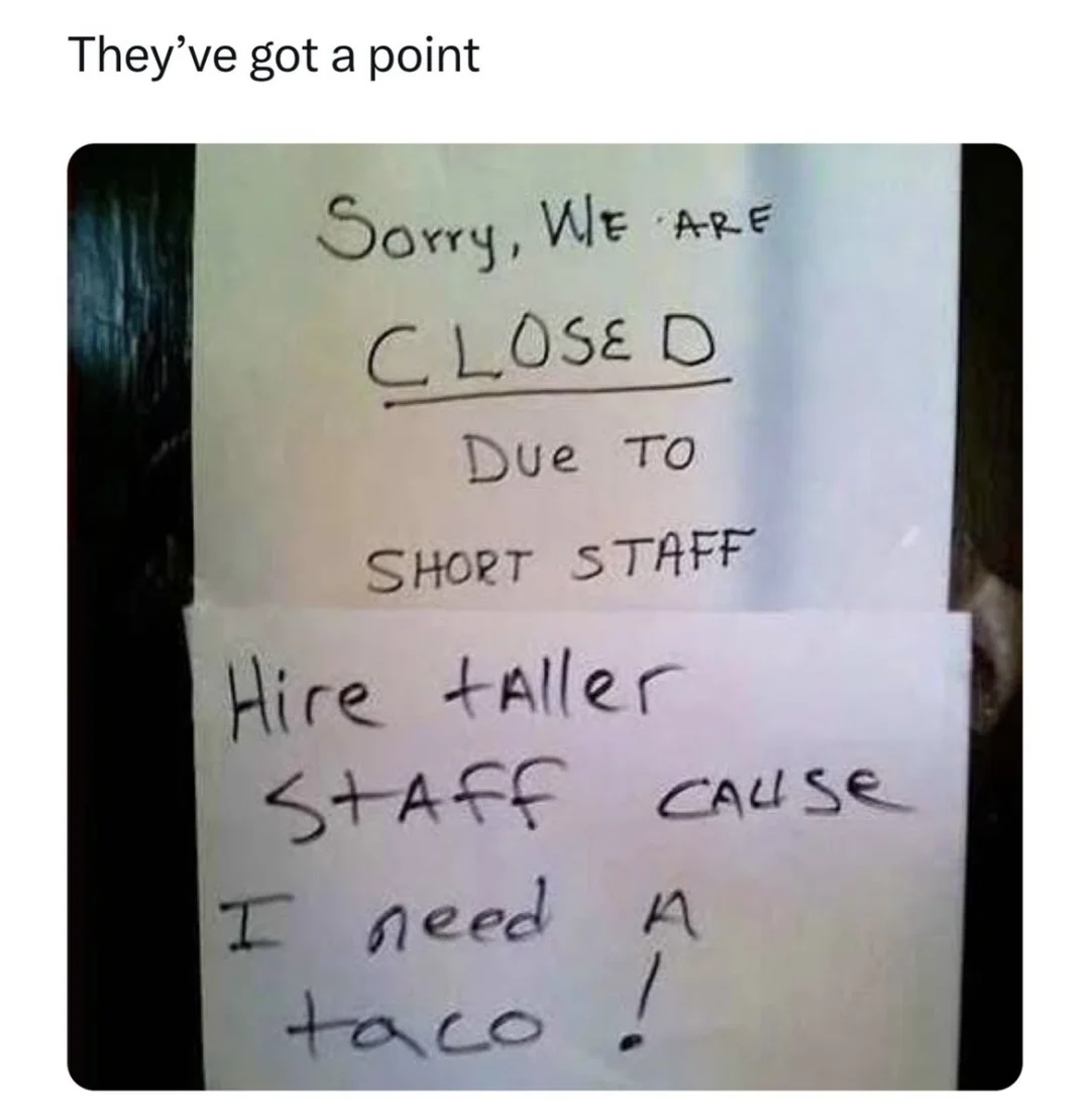 9)short staff人手不足。那人以为“矮的员工”,所以贴上“招些高点员工”纸条;