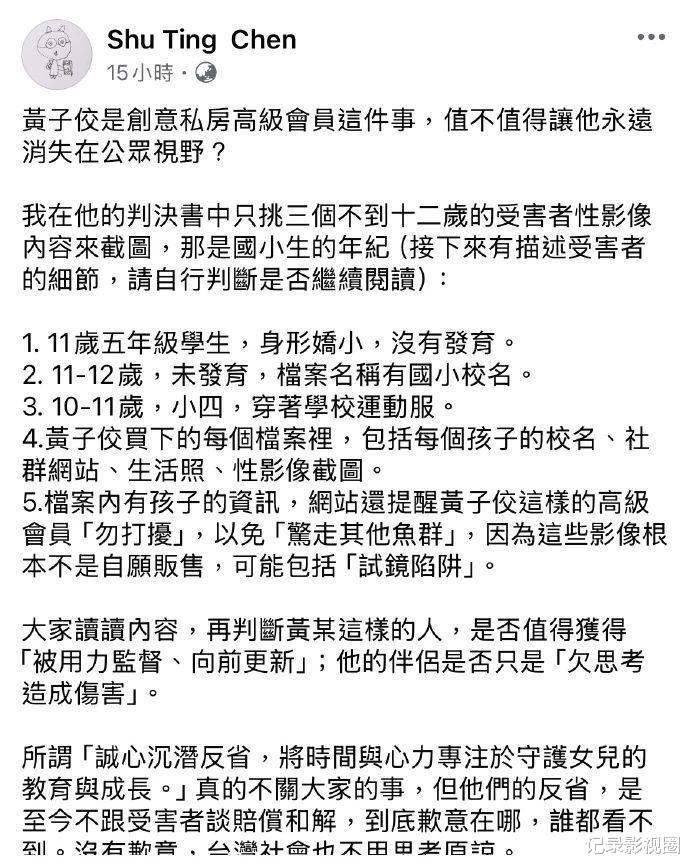 台湾资深媒体人吴静怡依据判决书,详细公布了黄子佼持有的儿少不雅片内容,其中包括儿童或少年身穿学校制服或运动服的性影像、手持学生证或手写个人年籍资料字条的性影像。甚至在一些社群软体或通讯软体中,还提及了年龄、出生年月日、就读学校等个人资讯的性影像。画面中的孩子,面貌稚嫩,胸部平坦未隆起,性器也未见发育,身形娇小,却遭受着恶魔般的对待 。这些影像被公然放在论坛页面,还被标示为 “学生妹”“校花”,附上就读学校年级、学校简称等信息,孩子们身着制服裸露胸部、阴部或进行性交行为的场景,就这样被肆意传播 。