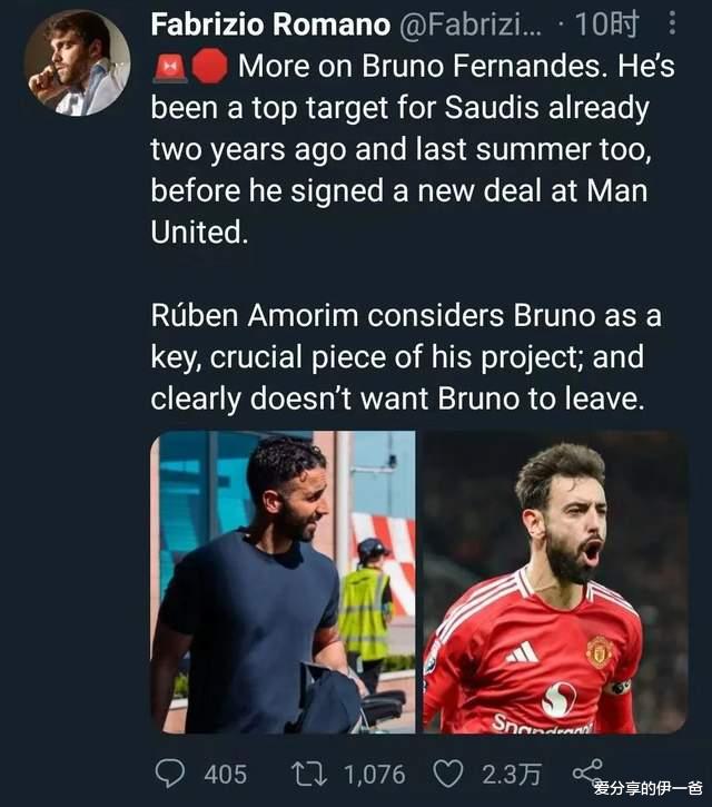 曼联主帅阿莫林的态度也很明确,B费是球队非卖品。今年3月,阿莫林曾斩钉截铁回应皇马与B费的传闻:“不,这不可能发生。他哪儿都不会去,我早和他谈过了,我们需要布鲁诺这样的顶级球员来带领球队。”
