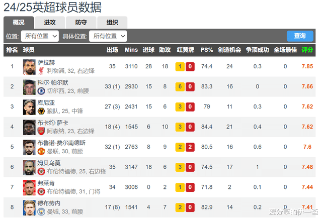 B费的英超赛季评分7.6分,所有球员里排第5,仅次于萨拉赫、帕尔默、库尼亚、萨卡。