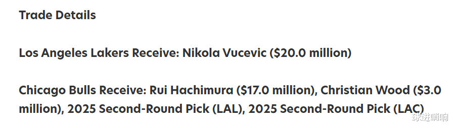 至于筹码方面,湖人队没有动用首轮签,仅送出两枚二轮签符合湖人管理层的需求。
