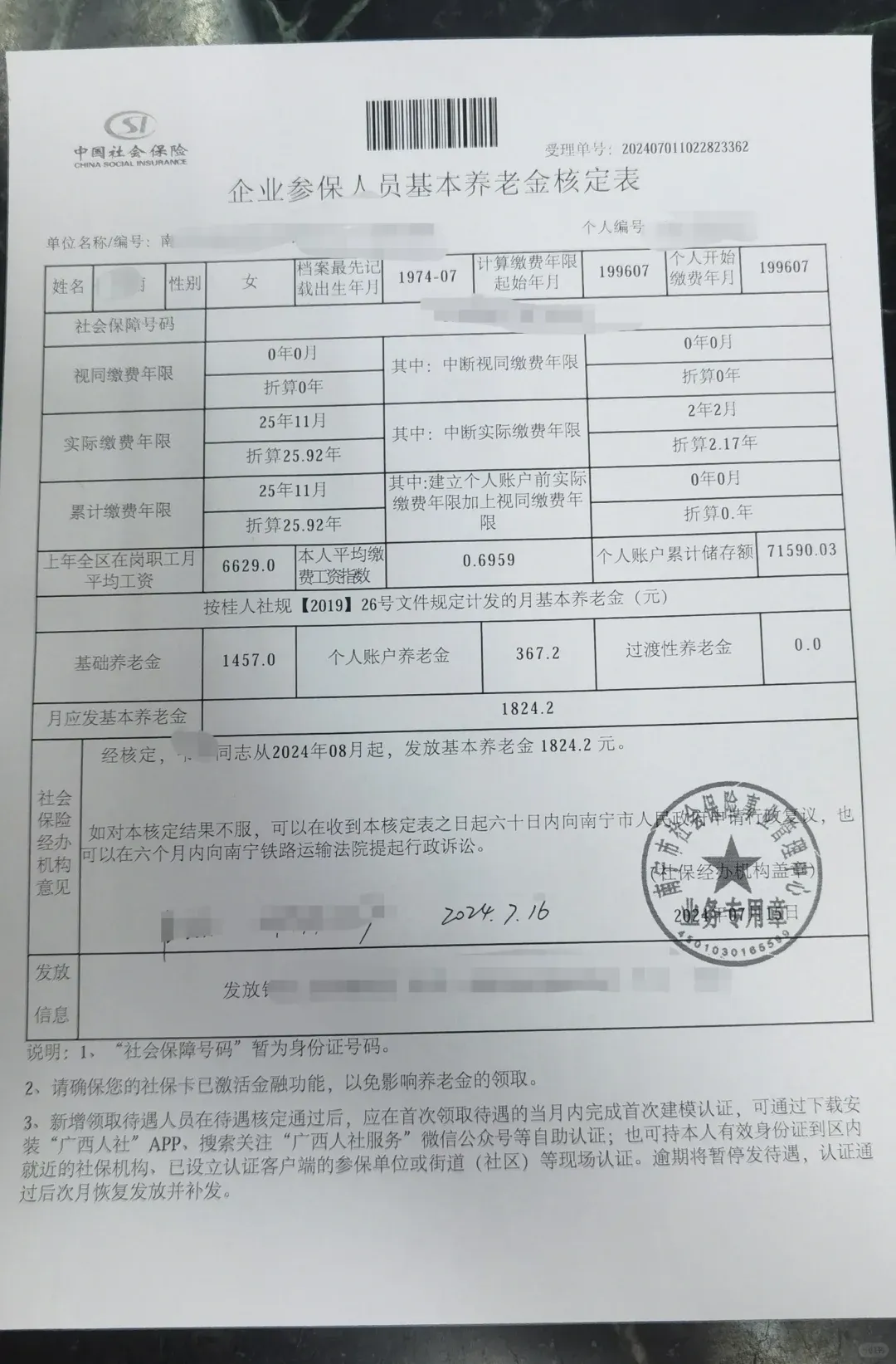 这位朋友1974年7月出生,属虎,1996年7月参加工作(22岁),2024年7月在广西南宁办理退休手续。