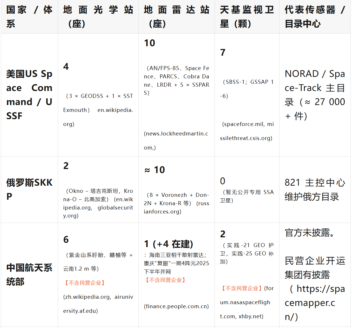 仅统计已公开承担 编目/SSA 值班 的固定传感器;弹道预警雷达若无明确回传轨道数据,不计入;海上/机载与商用传感器亦未列。