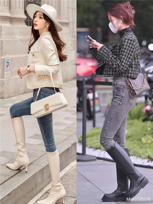 将紧身牛仔裤塞进长靴里的搭配方式,可以说是显高显瘦的终极秘密武器,长靴刚好裹住长裤,两者贴合得恰到好处,不仅能够拉长腿部线条,还能让腿看起来更加纤细。