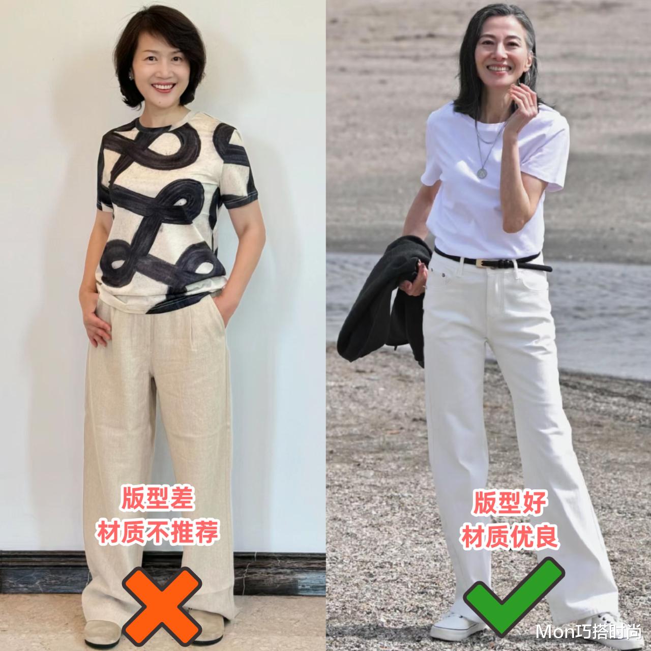切忌选择那些太软塌无形的面料,这样的裤子根本撑不起来,穿在身上就像一块挂在腿上的布,不仅不显气质,反而会让你显得邋遢。另外,版型太紧的裤子会无情地暴露出你胯宽的缺陷,让你看起来像个"梨形身材",这是我们都不想看到的。