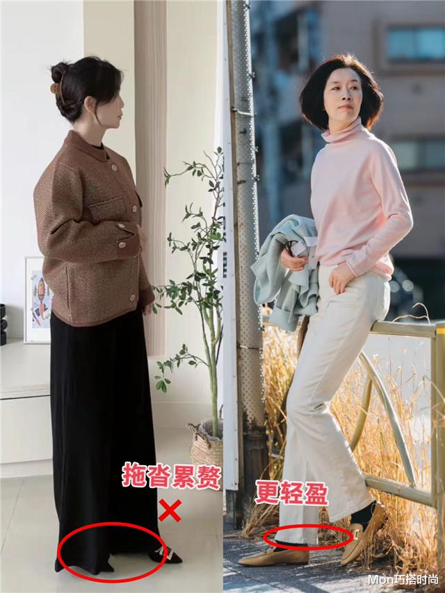 裤子如果过长拖地,会给人一种拖沓懒散的感觉,不仅容易把裤脚踩脏,还会让整个人的精气神都显得很低,更重要的是会严重拉低你的身高中心点,让你在视觉上变矮变胖,所以千万不要贪图所谓的"拖地裤"带来的慵懒感。