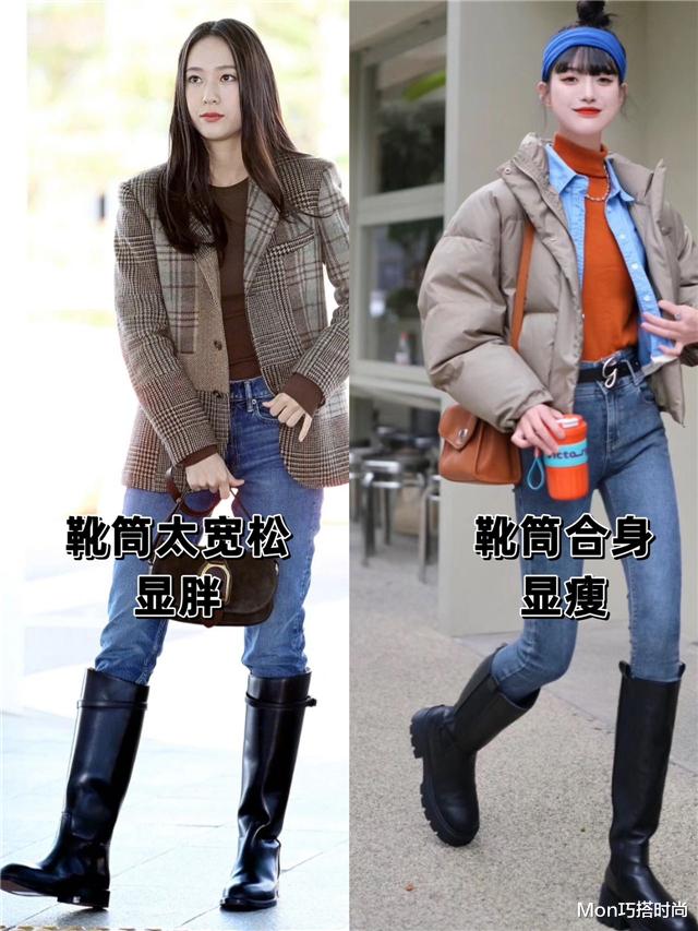 而太紧的靴筒则会勒住腿部,不仅穿着不舒适,还会在视觉上形成一种"香肠腿"的效果,让腿部线条变得不自然,所以选择靴子时一定要试穿确认靴筒的合适度。