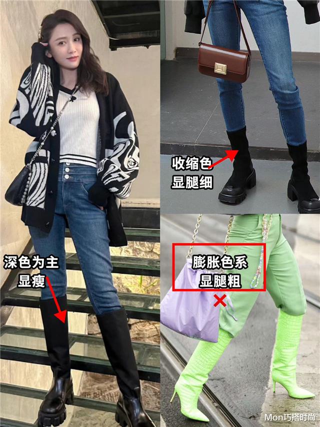靴子的颜色选择也是至关重要的一步,经典色如黑、白、棕色永远都不会出错,它们百搭且耐看;而那些亮色、饱和度高的颜色就是所谓的"膨胀色",不仅难以搭配衣物,还会在视觉上显得特别突兀,吸引了太多不必要的注意力;而深色系的靴子属于"收缩色",能够在视觉上让腿部线条更加纤细,达到显瘦的效果,这才是明智的选择!