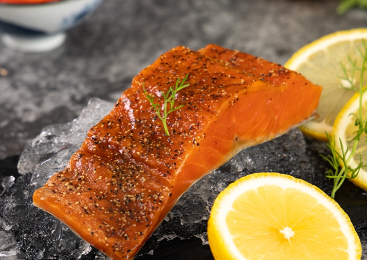 申和食品的黑胡椒三文鱼,原料选自挑剔的红鲑鱼。这种鱼偏爱摄食甲壳类与浮游生物,日积月累让鱼肉色泽更深、营养积淀更足。品牌坚持“整鱼选切” 的原则,只取鱼身精华部位,剔除多余筋膜与脂肪,每一块鱼肉都紧实饱满,纹理清晰,光是看着就让人食欲大开。