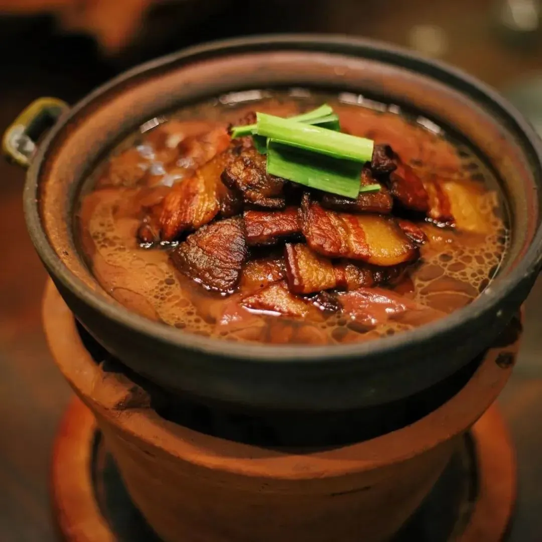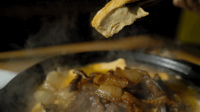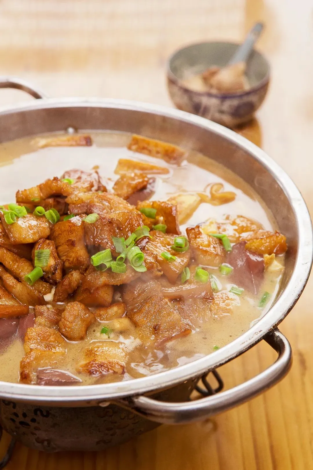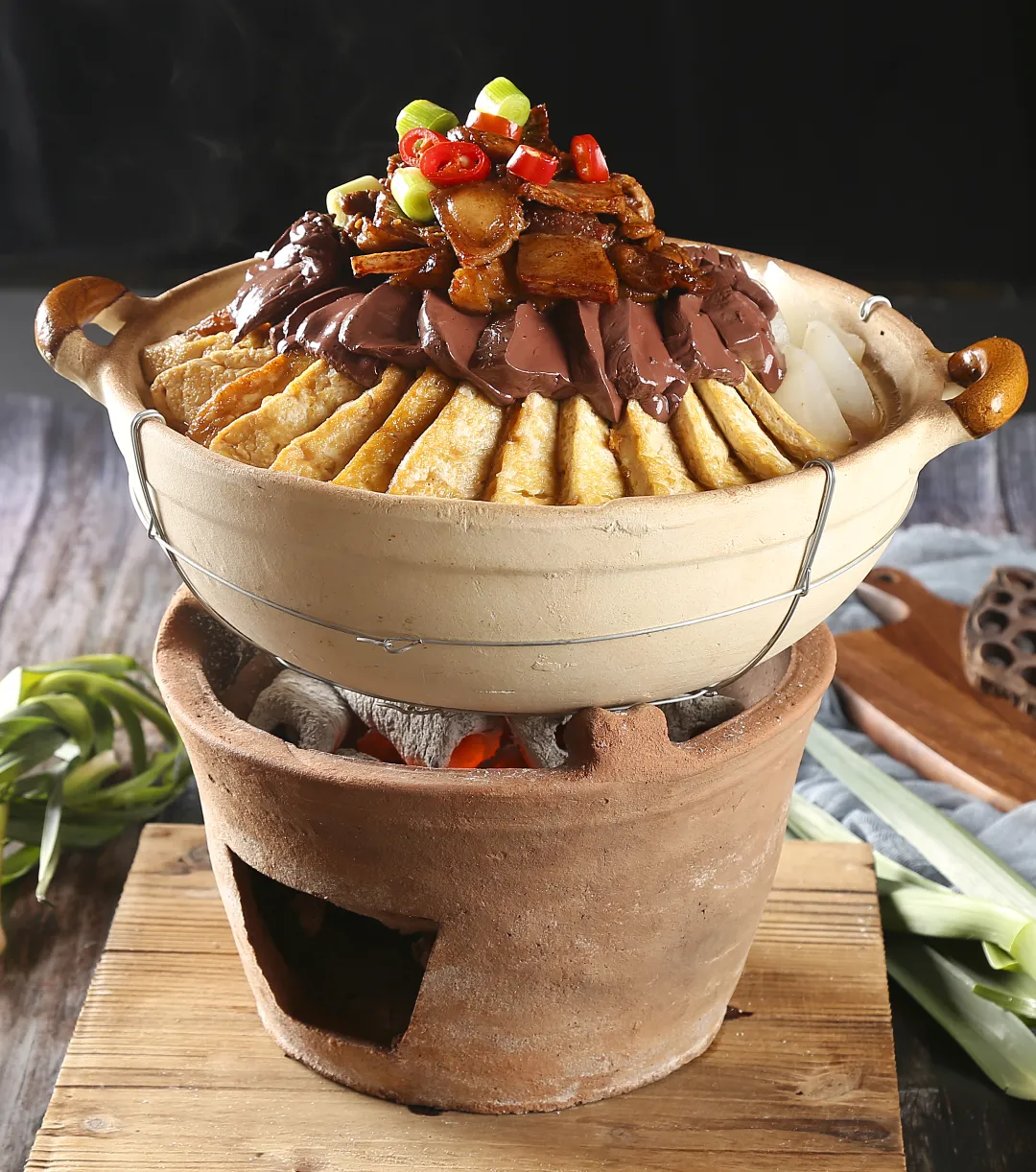 五花肉猪血慢煨,萝卜豆腐盛锅,撑起了整席风炉宴的老底子味道。炭火慢煨之下,味道交融一锅,肉和血越煨越醇香,萝卜和豆腐被鲜甜的肉汁浸润,又能解肉类的肥腻。