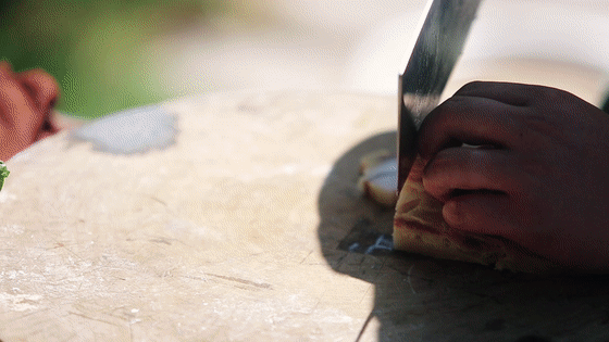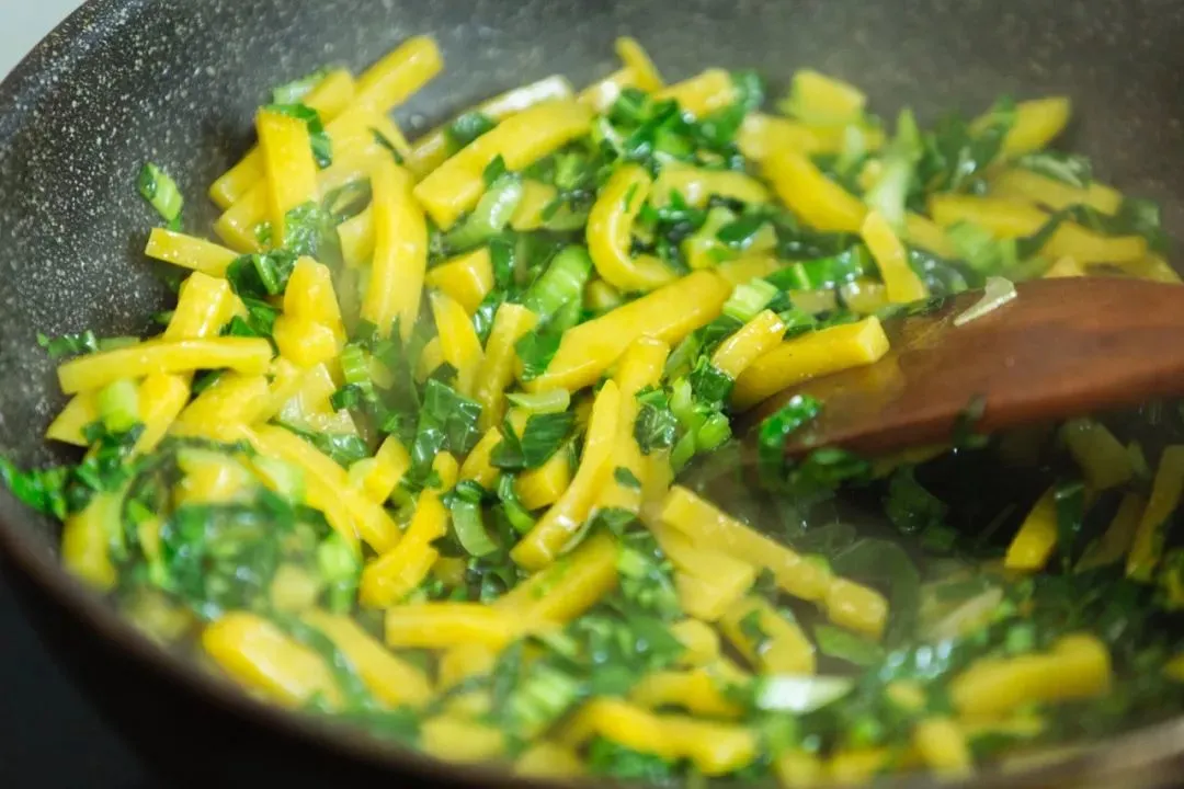 肉丁、茭白、香菇等馅料切成小丁炒熟,山粉(就是红薯粉)和水与馅料搅拌均匀,制作成厚厚的山粉糊。蒸笼里铺上薄薄的纱布,将山粉团子置于其上,大火蒸15分钟左右,让人垂涎欲滴的美味就可以出锅了!