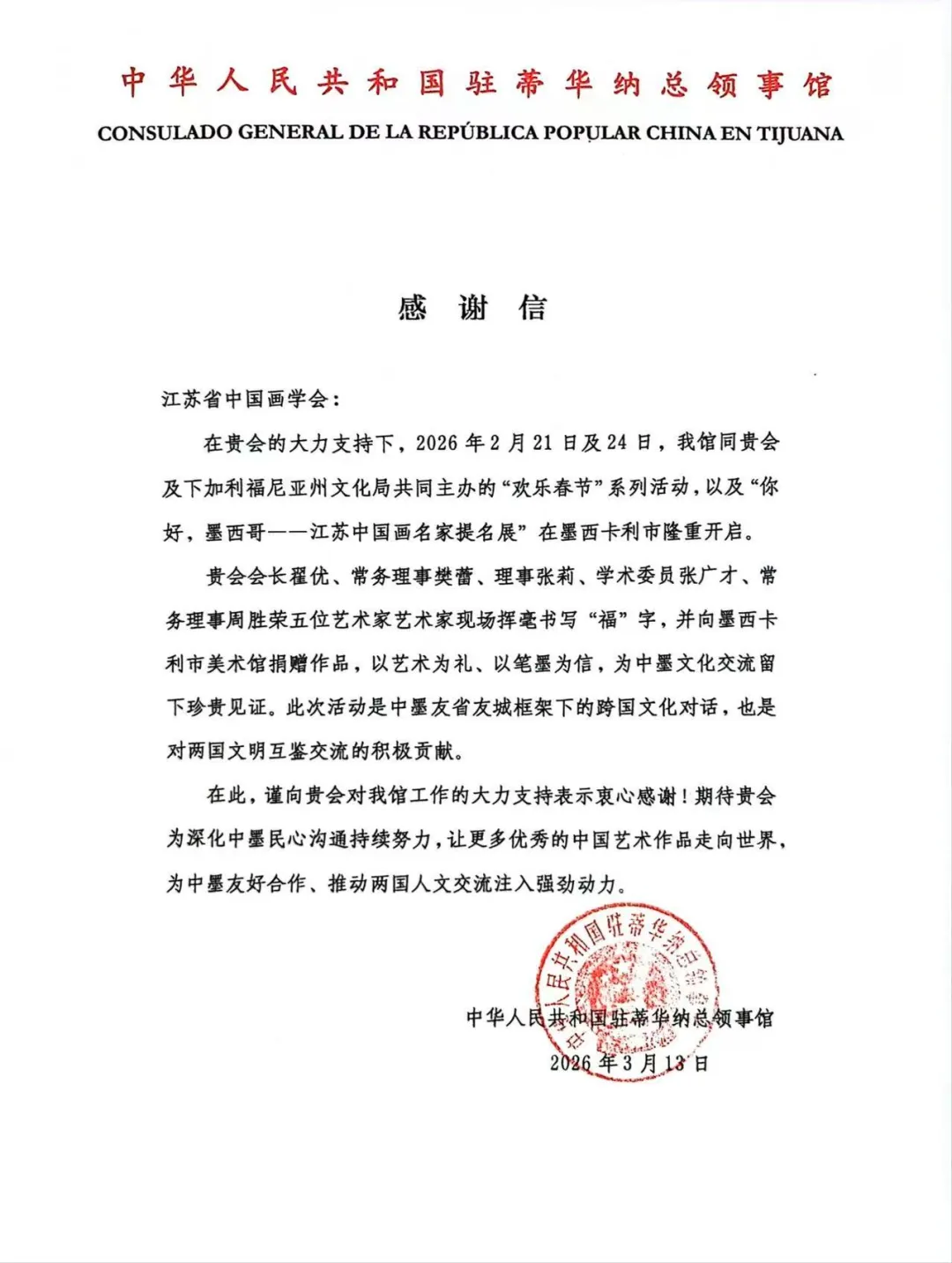 近日,中国驻美国大使馆、中国驻蒂华纳总领馆先后向江苏省中国画学会发来感谢信,对学会积极参与中美、中墨2026“欢乐春节”系列文化交流活动,以中华书画艺术搭建民间友谊桥梁、推动中外文明互鉴所作出的积极贡献,表示衷心感谢与高度认可。