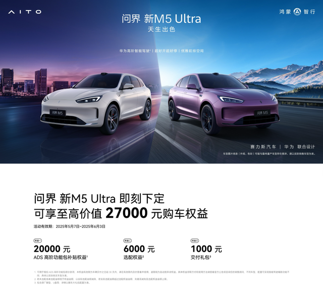 新用户也有好权益,在5月7日至6月3日下定问界新M5 Ultra,可享至高价值 27000 元购车权益,包含20,000元ADS高阶功能包补贴权益、6,000元选配金和1,000元交付礼包,进一步降低购车成本。错过五一不要紧,抓紧下订,让问界新M5 Ultra陪你开启难忘的端午自驾之旅吧!