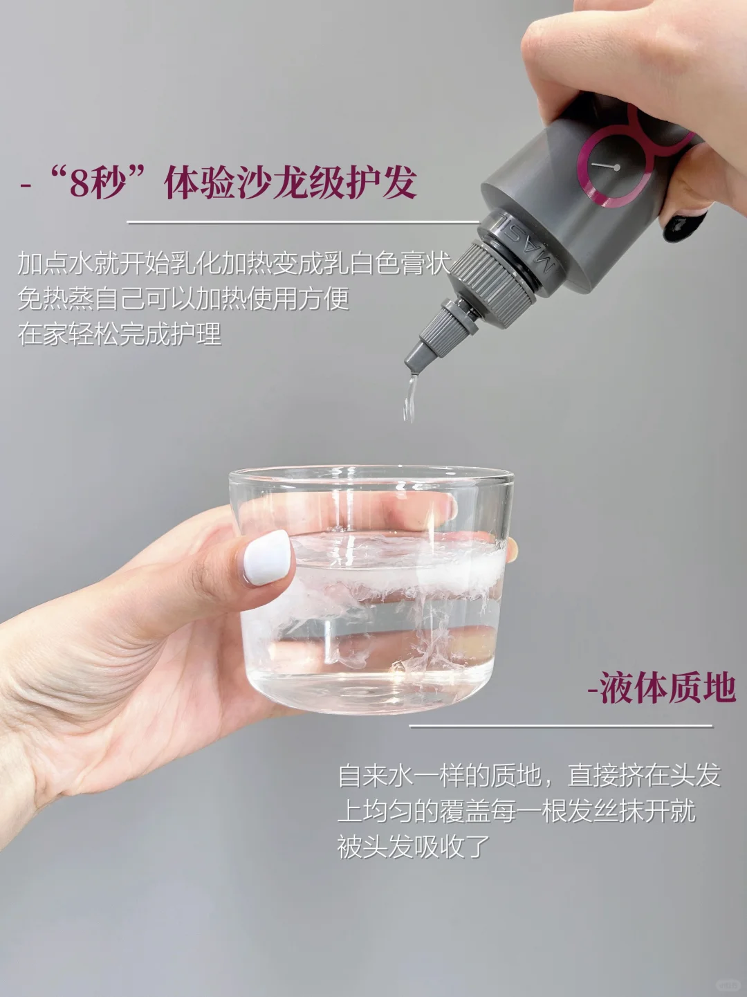 加点水就开始乳化加热变成乳白色膏状,然后钻进头发丝里搞维修,给头发带来一次快速的沙龙热蒸护理