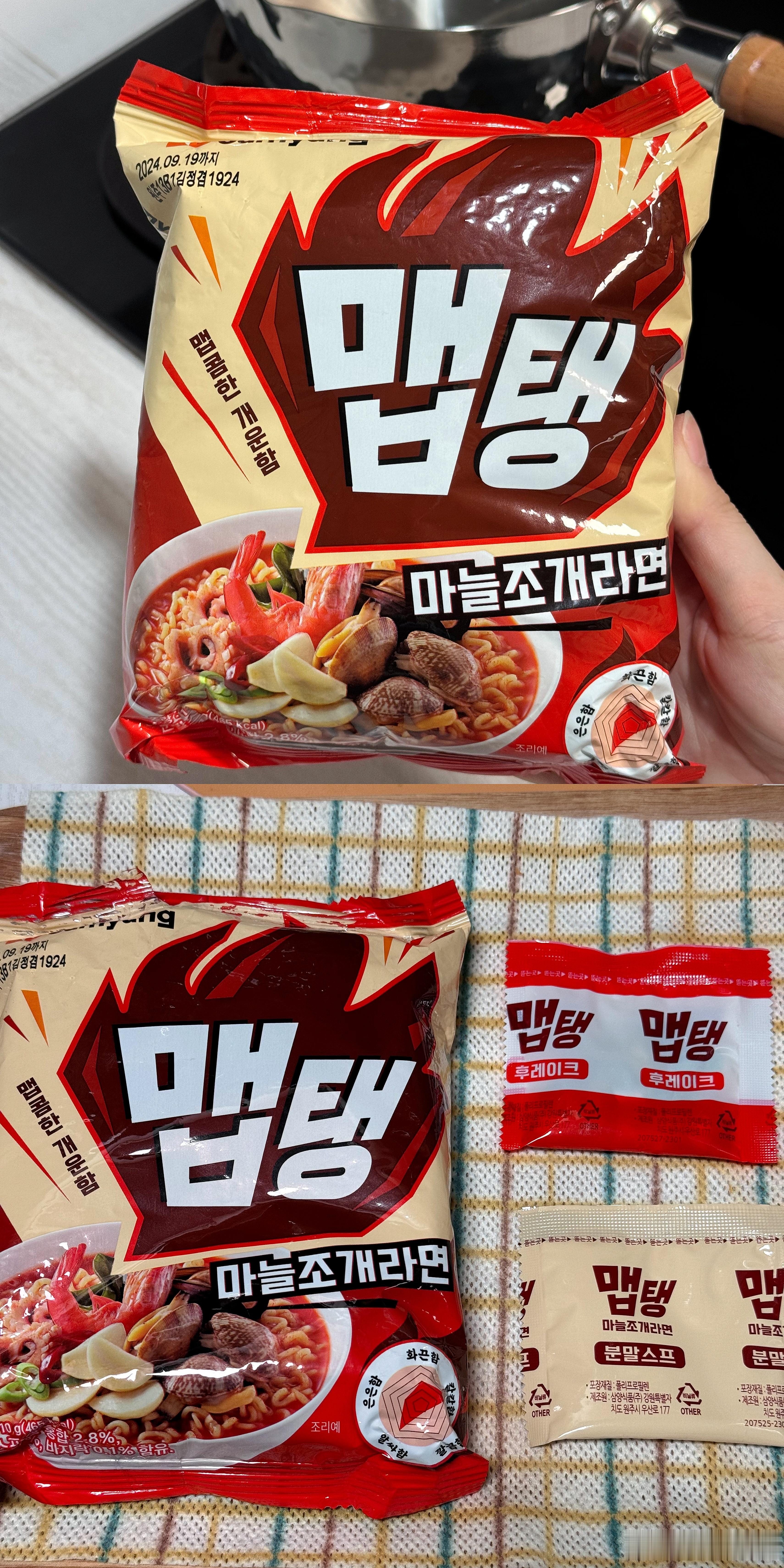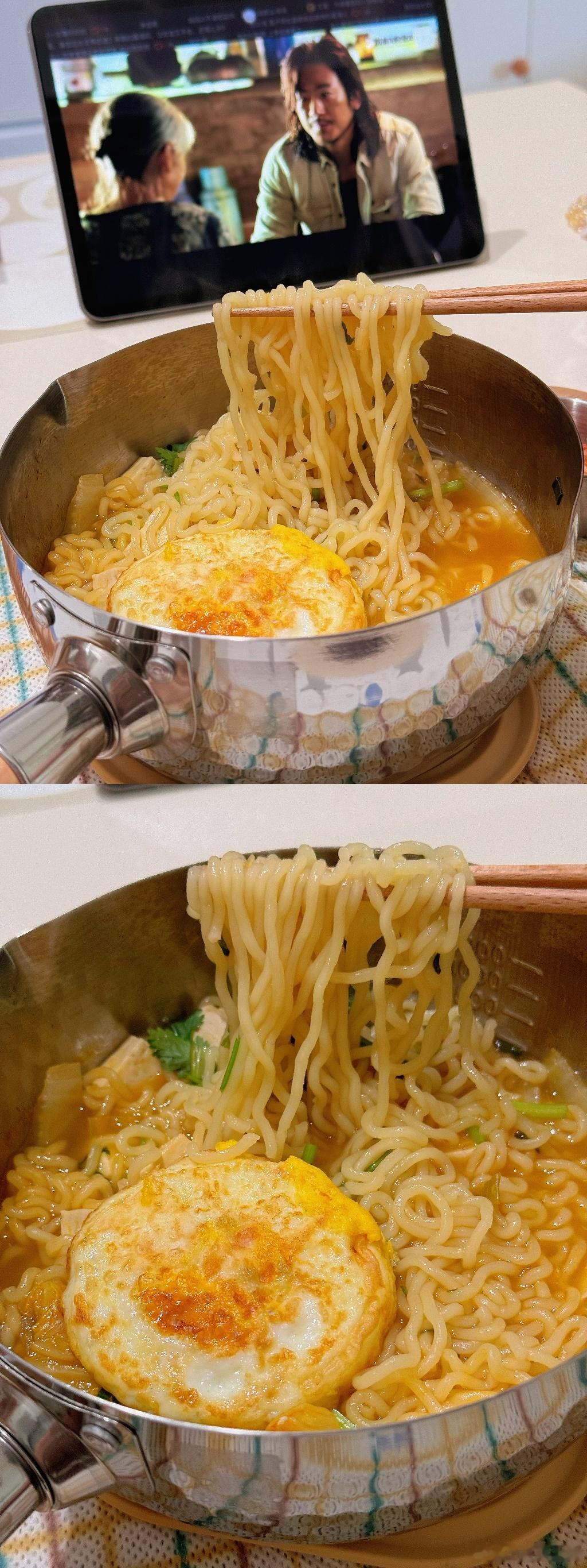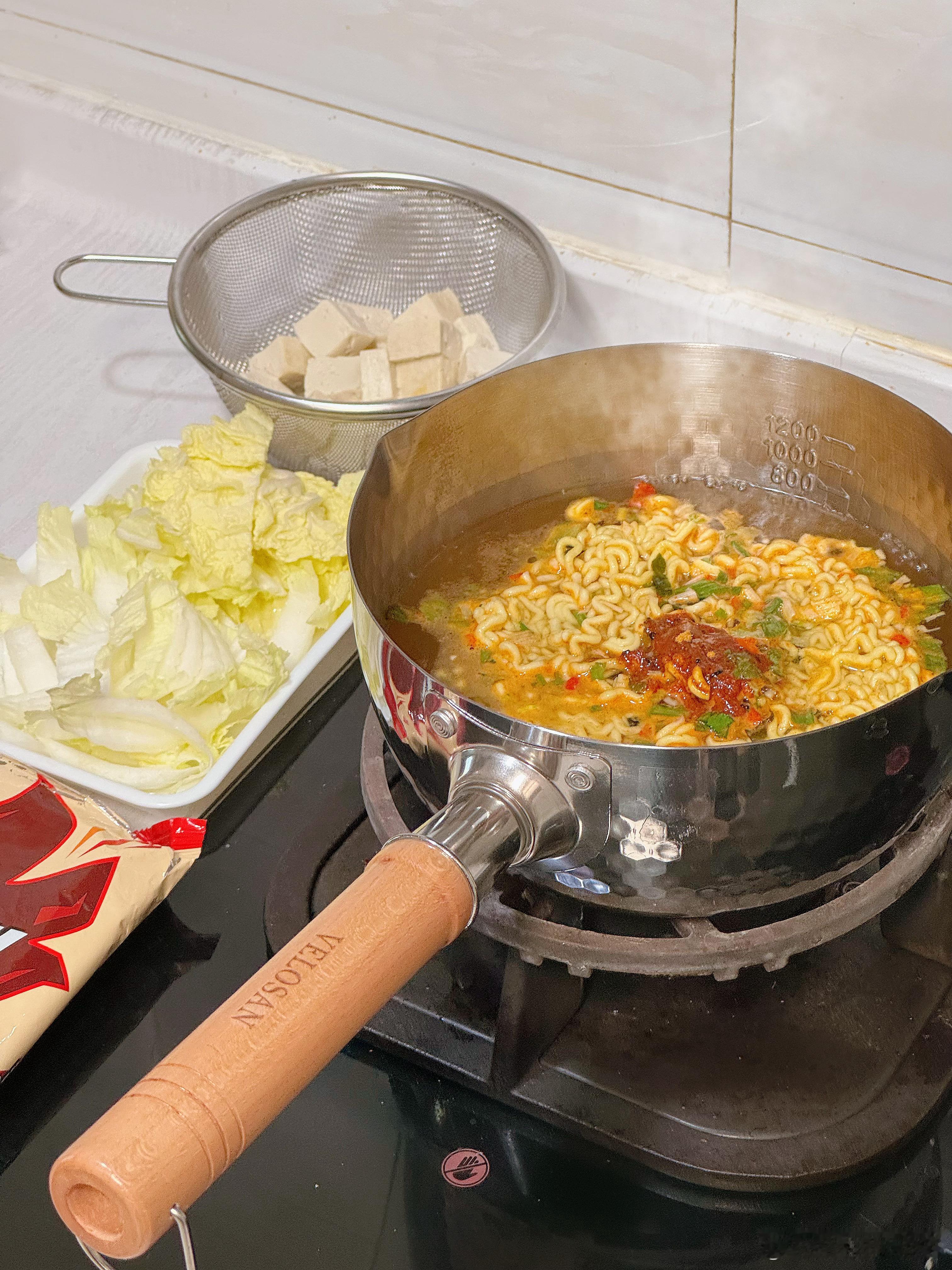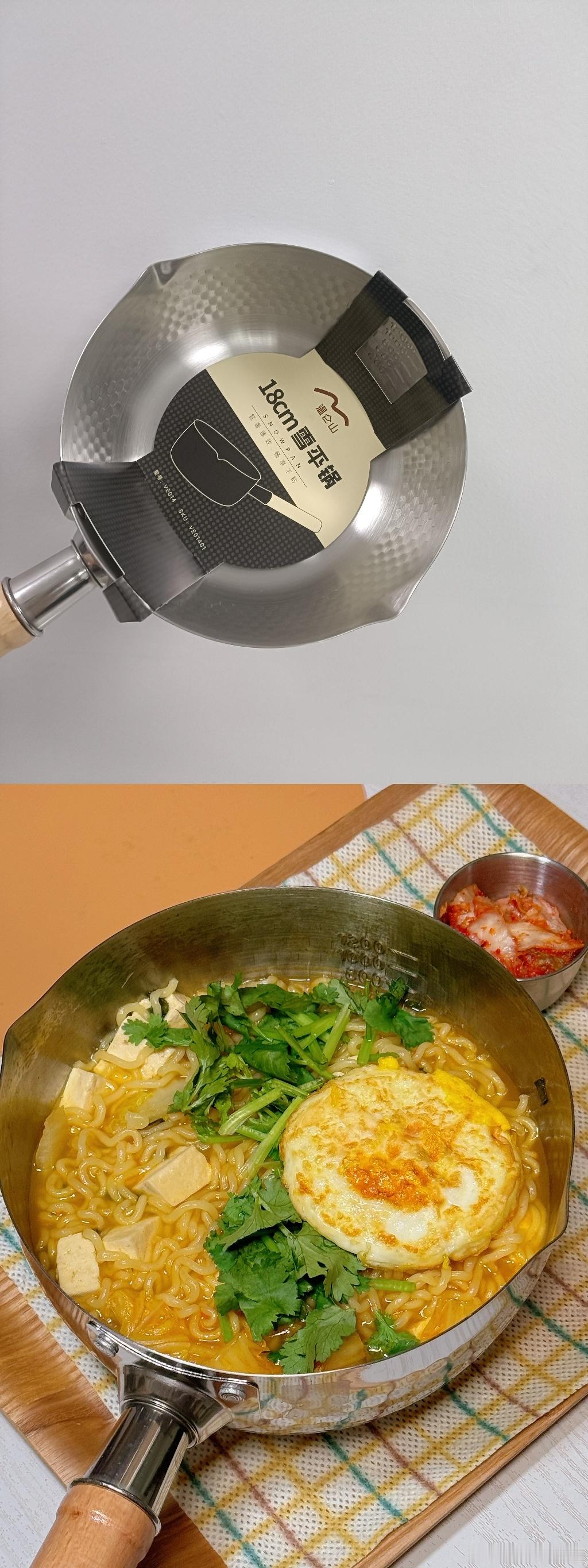 18cm口径煮1-2人份的餐食刚刚好!今天煮一包小韩带回来的蒜香蛤蜊拉面🍜自己还加了配菜娃娃菜、豆腐、和煎蛋🍳汤底是清汤微辣,很鲜的海味!