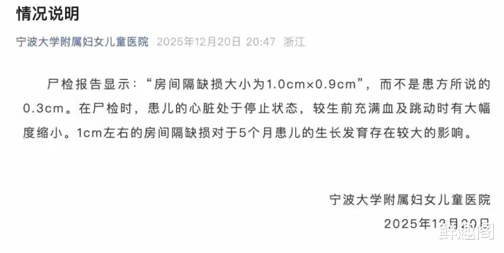 12月14日,宁波市卫健委发布官方通报,确认医疗团队存在 “手术风险评估不足、手术操作存在过失” 等问题,并对医院相关医务人员进行了严肃处理。我们简单的了解一下事情的具体情况,5个月大的早产儿小洛熙在2025年11月11日的例行检查中,心脏彩超提示存在两处房间隔缺损。