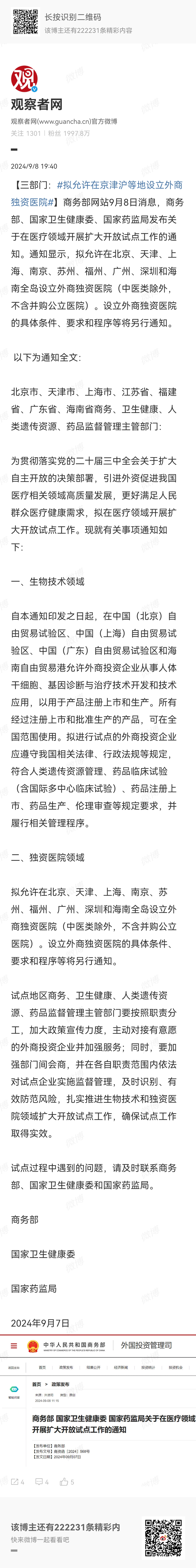 微评:感觉这个开放力度还不够,为什么我们大芜湖不能设立外商独资医院?如今中国医院太黑,包括公立医院都是侵吞医保资金的“吞金兽”,希望外商独资医院能改变这个状态。在外商独资医院进入之前,我给相关监管部门一个建议,那就是在药品、医疗器械进口方面对他们取消限制,允许他们自主定价(备案即可),然后是违规重罚。