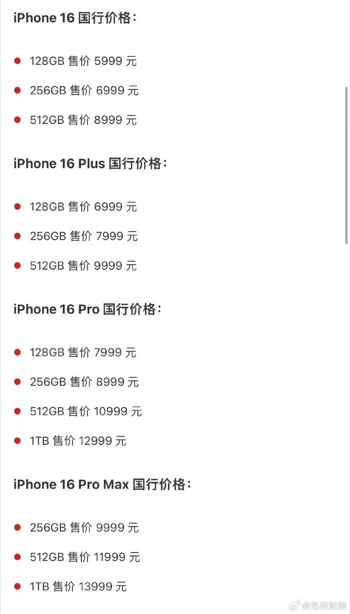 【iPhone16价格】最低价格5999元,相当于年轻人一个多月的工资。说句实在话,我这个资深公务员退休的老汉真的下不了手,虽然我的家人也都在使用苹果,但我是一直在使用2000多块最贵3000刚出头的国产手机。希望国产高档手机不要动不动卖五六千、七八千甚至超万元的,将高档机降到4000块钱以下,把手机整体价格打下来,也算是为年轻人做了一件好事。