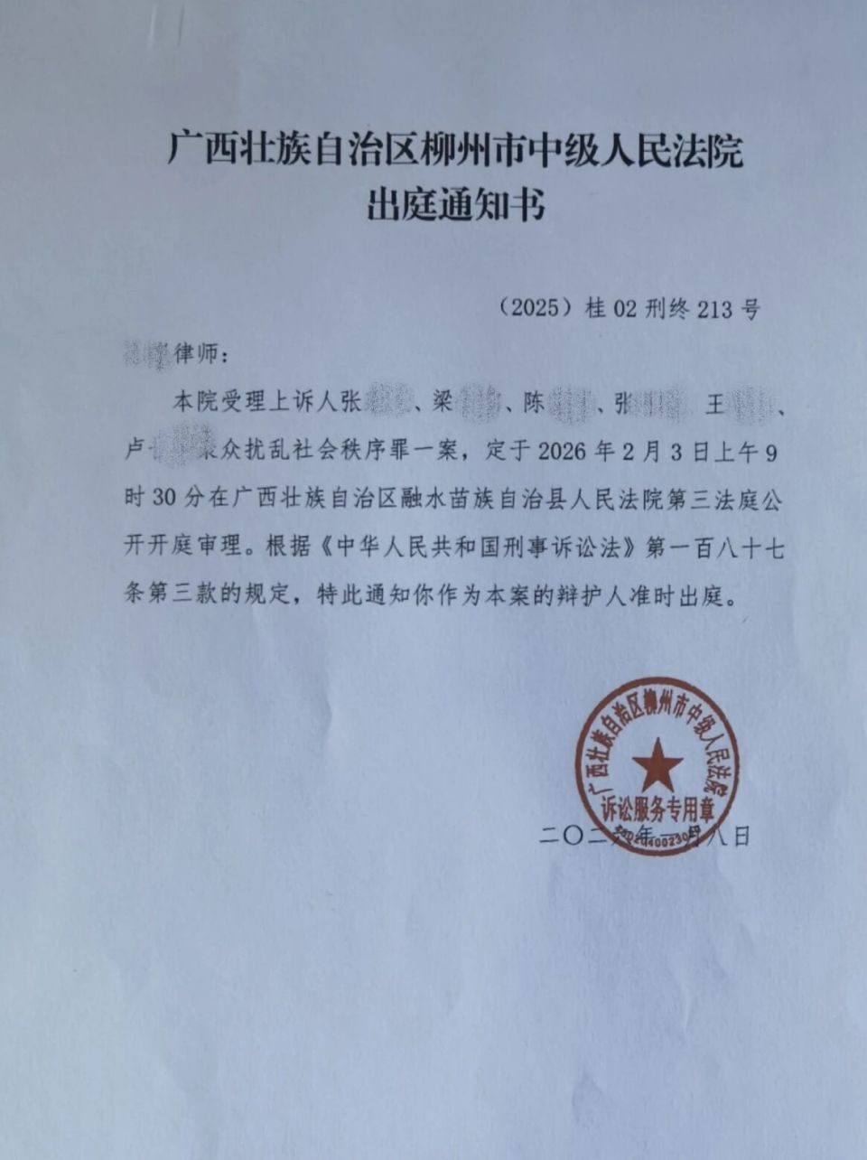 1月30日,新黄河记者从被告辩护律师处获悉,目前张某武、梁某铭等6人对于一审法院判决不服,认为自己不应以聚众扰乱社会秩序罪论处,均已进行上诉,案件将于2月3日在柳州市中级人民法院开庭审理。