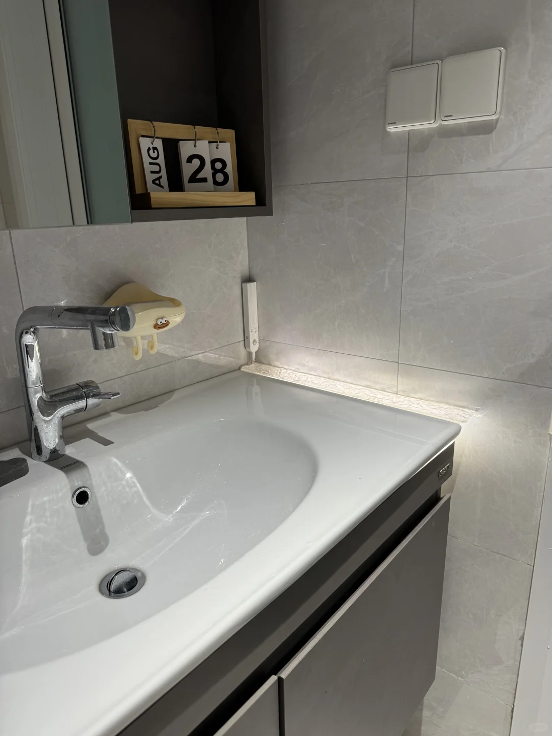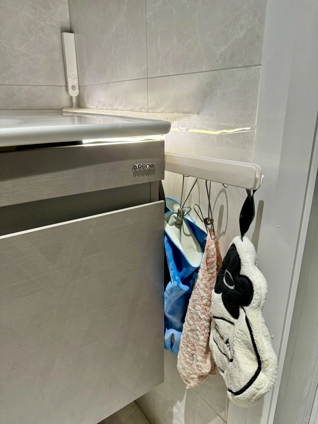 精装房的三面洗漱间,94公分 定制浴室柜的价格比成品贵一倍 还是选择了成品,那多出来的4公分怎么办 跟着抄作业真的好看实用 1️⃣感应灯带➕石头纹亚克力板➕玻璃胶 会发光的区域就出来了 2️⃣给柜体上贴可伸缩挂钩➕长尾挂钩 抹布,手套,擦手巾都可以隐形,用的时候拉出来就行 收纳还是随手能拿到,实用性要强,过度收纳的结果就是总想不起来用