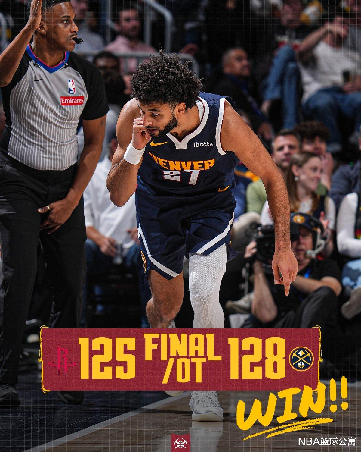 阿门中投三不沾,穆雷被阿门犯规,随后2罚全中,掘金领先6分占据场上主动权。申京命中2+1,穆雷单打不中,乌度卡请求暂停。申京绝平远投不进,布朗抢下篮板,比赛时间走完。最终,掘金以128比125险胜对手,火箭本赛季惨遭丹佛双杀。5连胜的丹佛继续排名西部第2,火箭从西部第3跌至第5。