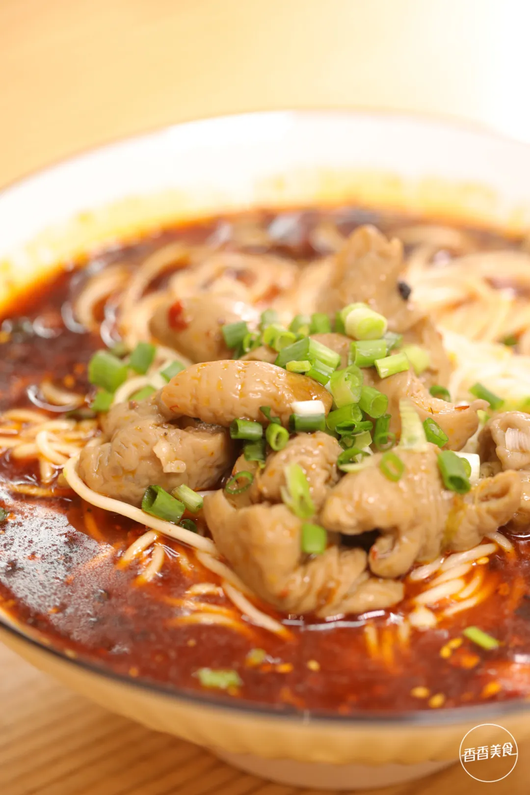 「肥肠小面」肥肠小面里的肥肠是必须要先吃的,一口咬下油滋滋、香汪汪,又软又筋。因为是加了汤的小面,面条被红油汤汁充分浸润后,味道更足了。一口肥肠一口面,那叫一个舒坦!