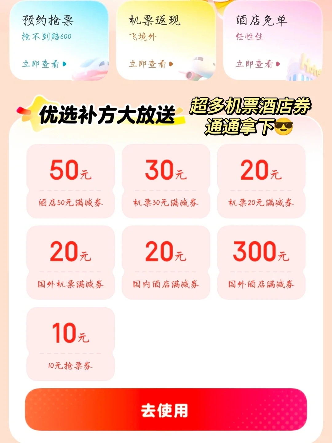 3⃣️点进去就能拿下一大堆机票和酒店券啦,还能领50元的国际机票补贴!