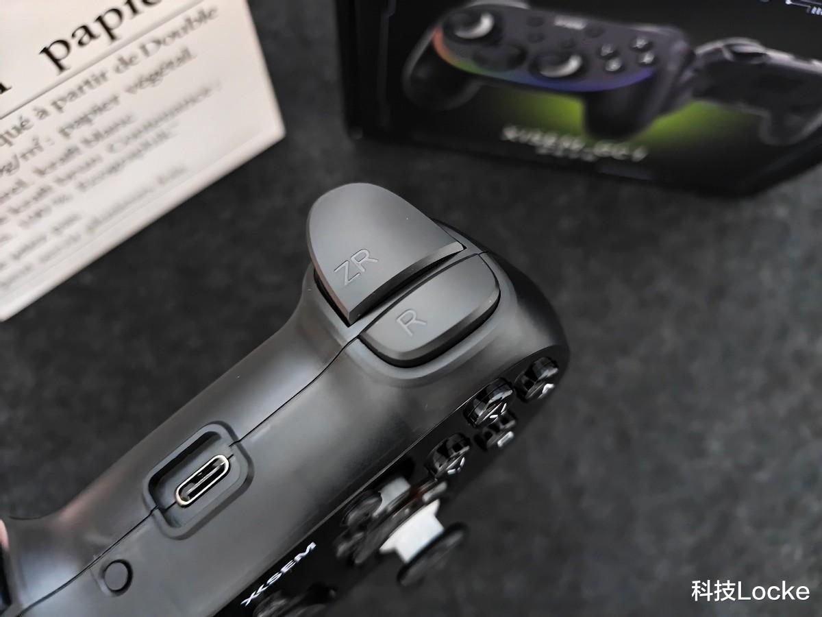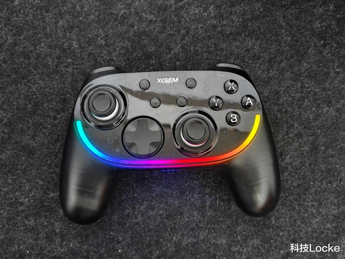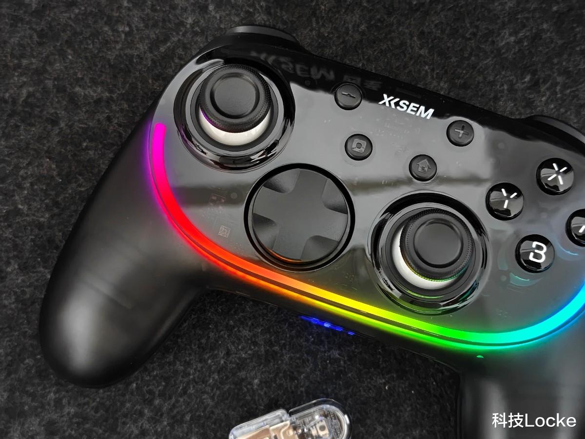 开箱第一眼的好感来自机身表面那层“雾面半透明”的处理。不是那种廉价透塑料的亮光,而是细腻的纳米雾化质感,灯光下能看到内部结构若隐若现,再配合环绕的RGB氛围灯,赛博味儿挺到位;壳体拼缝均匀,按键帽不松垮,扳机键没有毛刺与边缘割手问题。重量约214g,拿在手里手感舒适,比我常用的一只X系手柄轻一些,但抓起来并不空,握把的充盈度刚好,15°握角契合掌心,NanoSkin的亲肤涂层让它在夏天手汗状态下也不打滑。